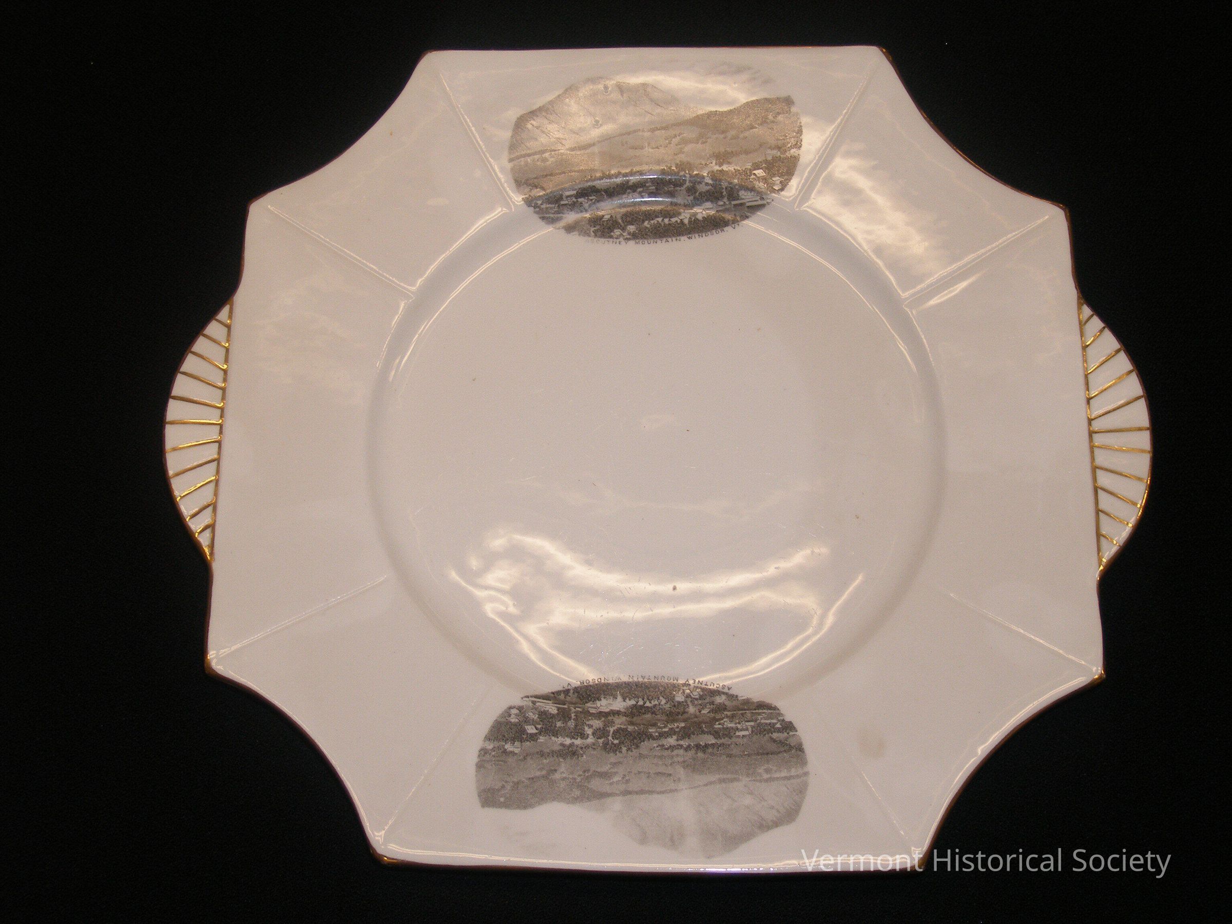 White ceramic decorative plate. The plate is square with concave corners. Two of the corners have semi-circular additions. There are two oval images printed on the rim at the flat edges. Both images show the same scene, but are oriented in opposite directions. The images show an aerial view of a valley with a rocky mountain in the background. The images are labeled, "ASCUTNEY MOUNTAIN, WINDSOR, VT." The reverse of the plate is labeled, "Made in England. Cabot Bros., Windsor, Vt."Context