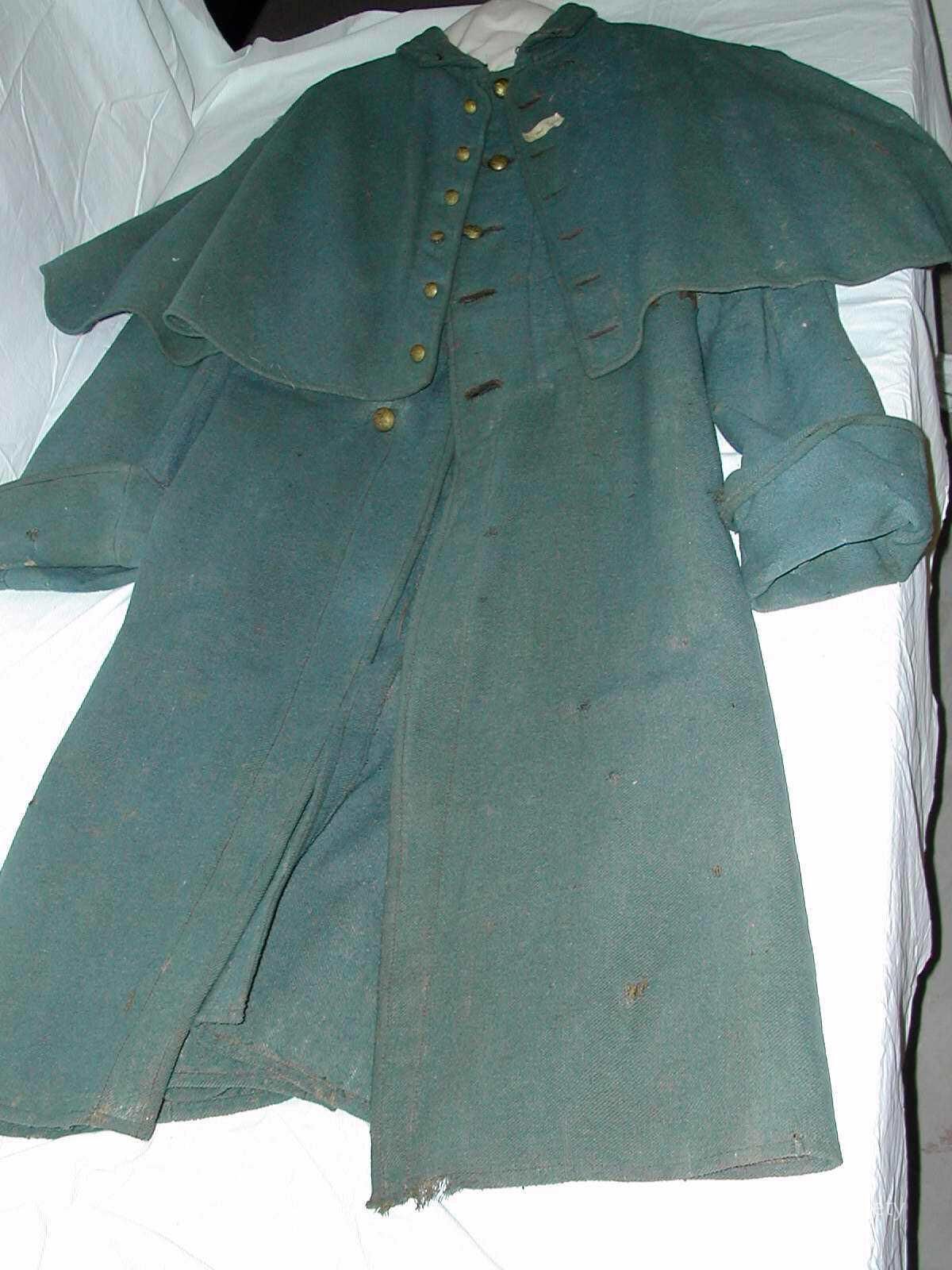 Blue wool overcoat. The coat opens in the center front and secures with 5 brass buttons. The neckline has a fall collar and attached capelet. The capelet buttons down the center front with 5 brass buttons. The buttons on both the coat and capelet are impressed with an eagle and shield. The inscription, "Fifer/T. B. Walter/CoE 15" is hand inked onto the lining of the proper left sleeve near the shoulder. The inscription "U. S. Inspector/Wm. Phillips/[illeg]". The coat is lined in wool with canvas pockets attached to the interior on each side.