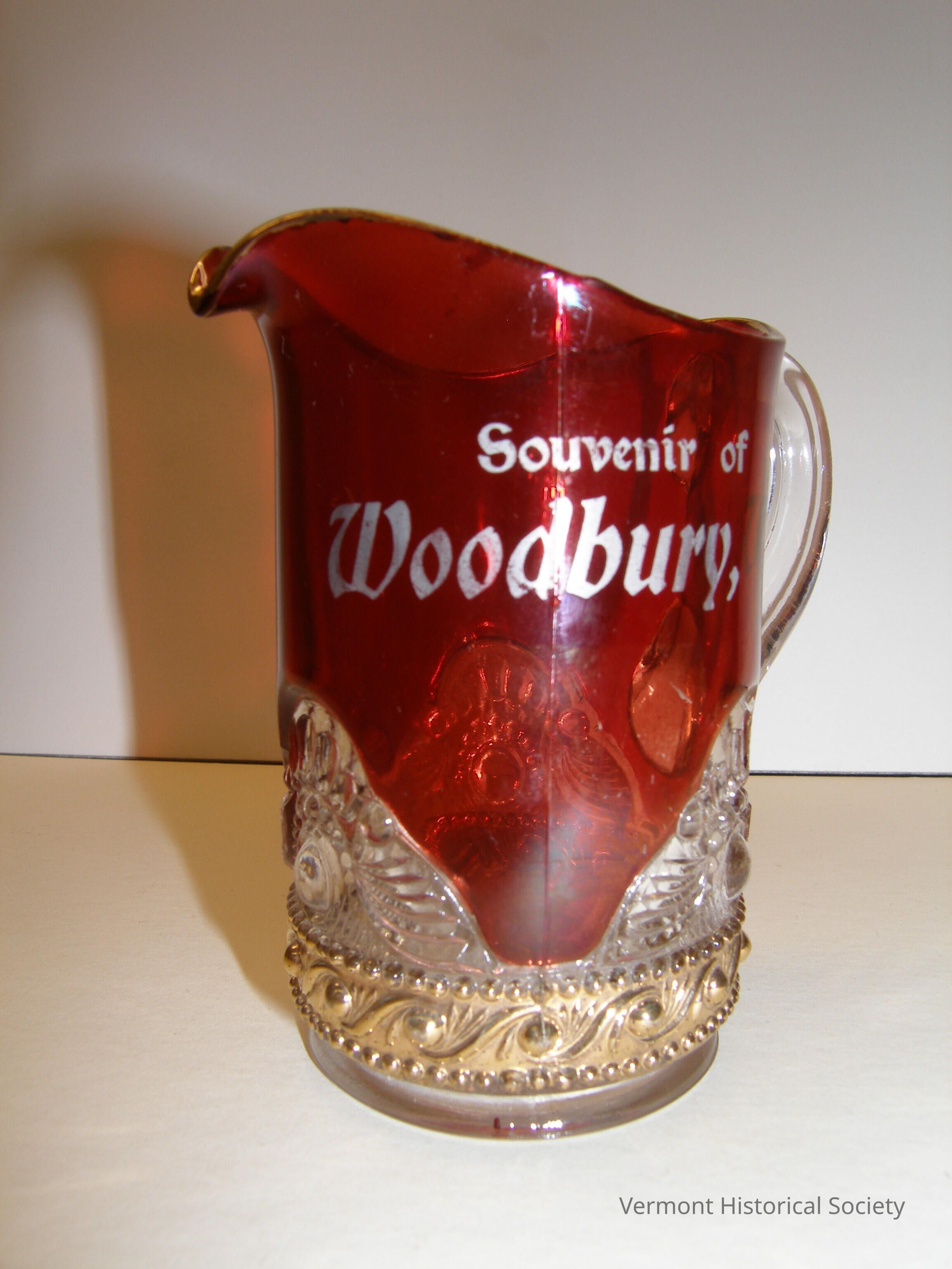 Molded glass cream pitcher. The handle and base of the pitcher are clear glass, and the base is molded into facets to imitate cut crystal. The upper portion of the pitcher is red glass and is printed with the inscription, "Souvenir of Woodbury, Vt." in white.