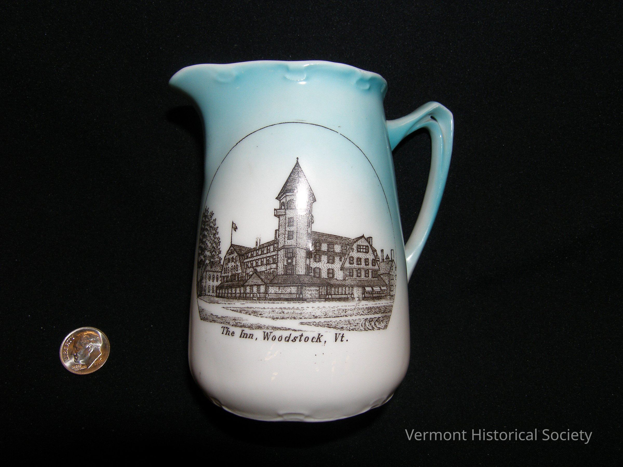 White ceramic cream pitcher airbrushed with light blue at the top. One side of the pitcher is printed with an engraved illustration of a large building that takes up an entire city block. The building has a large tower at one corner. The image is labeled, "The Inn, Woodstock, Vt." The bottom of the pitcher is marked, "J.H.R. & Co. Made in Germany for The Variety Store, Woodstock, Vt."Context