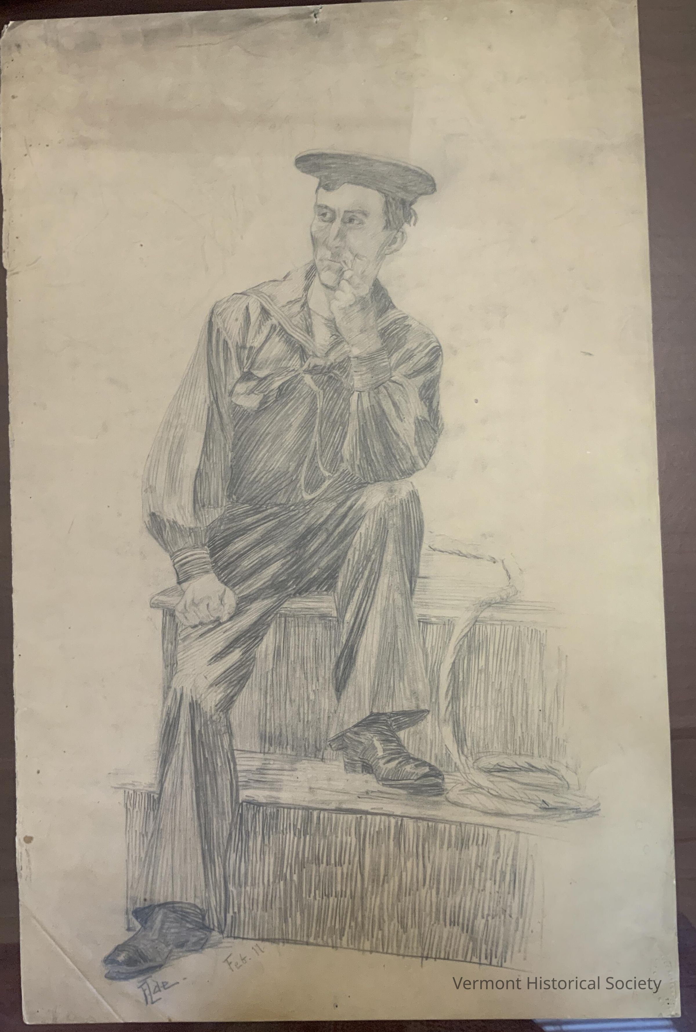 A drawing of a sailor sitting on some steps next to a rope and smoking a pipe as he looks into the distance. It is signed in the bottom left hand corner and dated “Feb. 11.”Type of Drawing