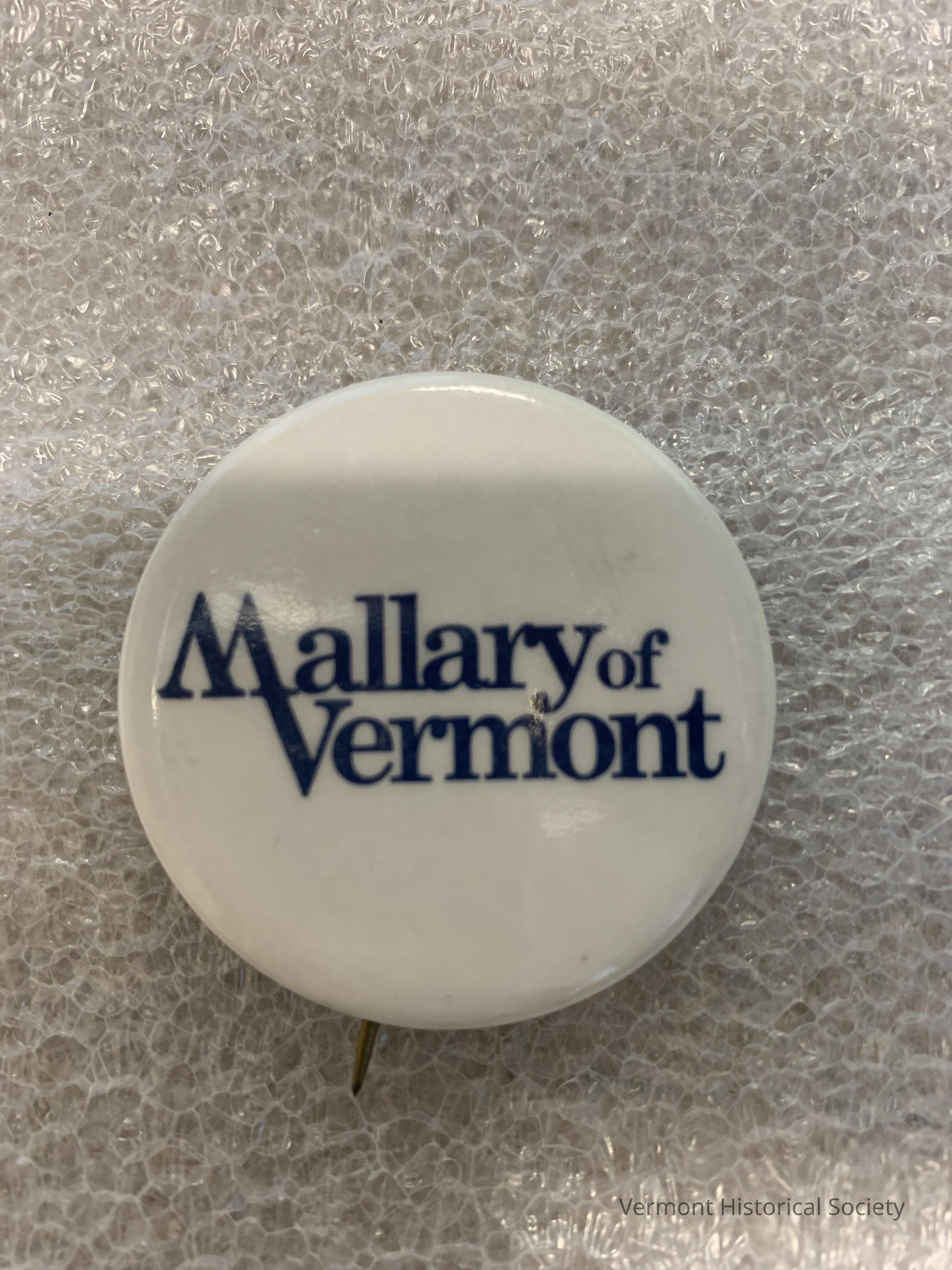 Round white metal button with the blue inscription, "Mallary of Vermont".Context