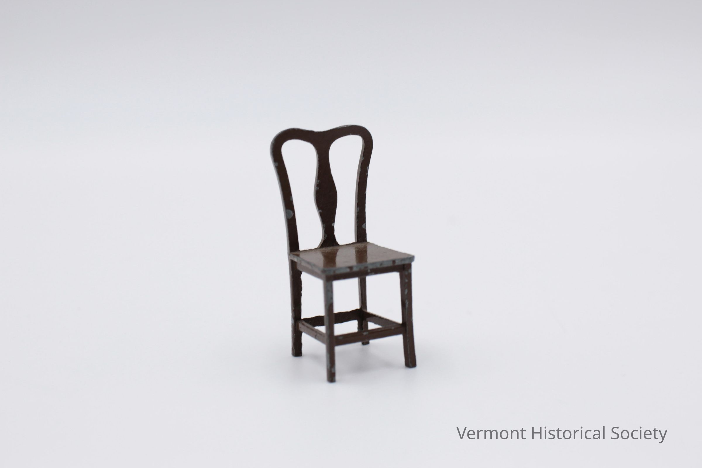Miniature side chair sized for a dollhouse. The chair is made of cast iron and painted brown. It has a central spat on the back.Context