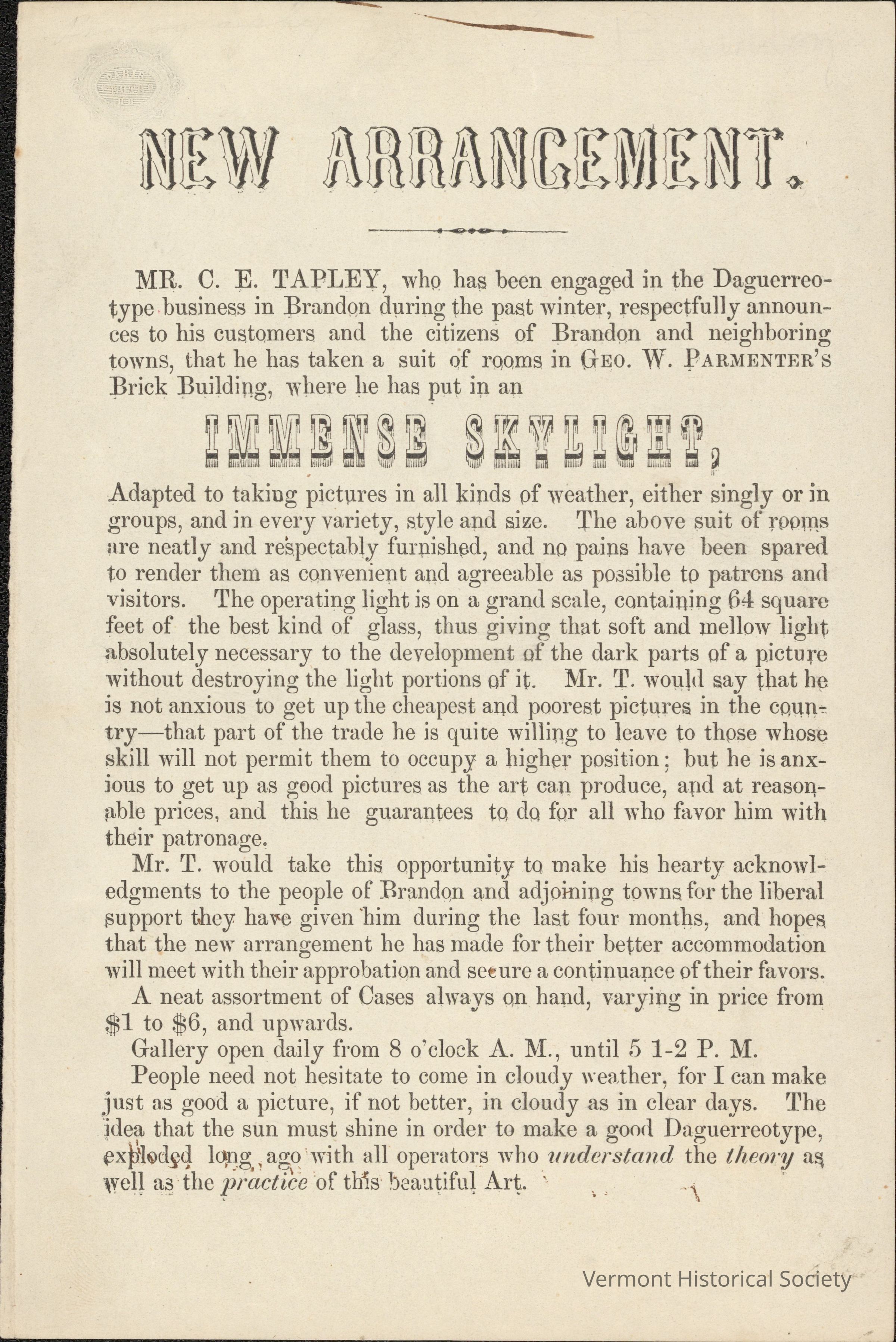 Advertising card for daguerreotypes by Mrs. Tapley