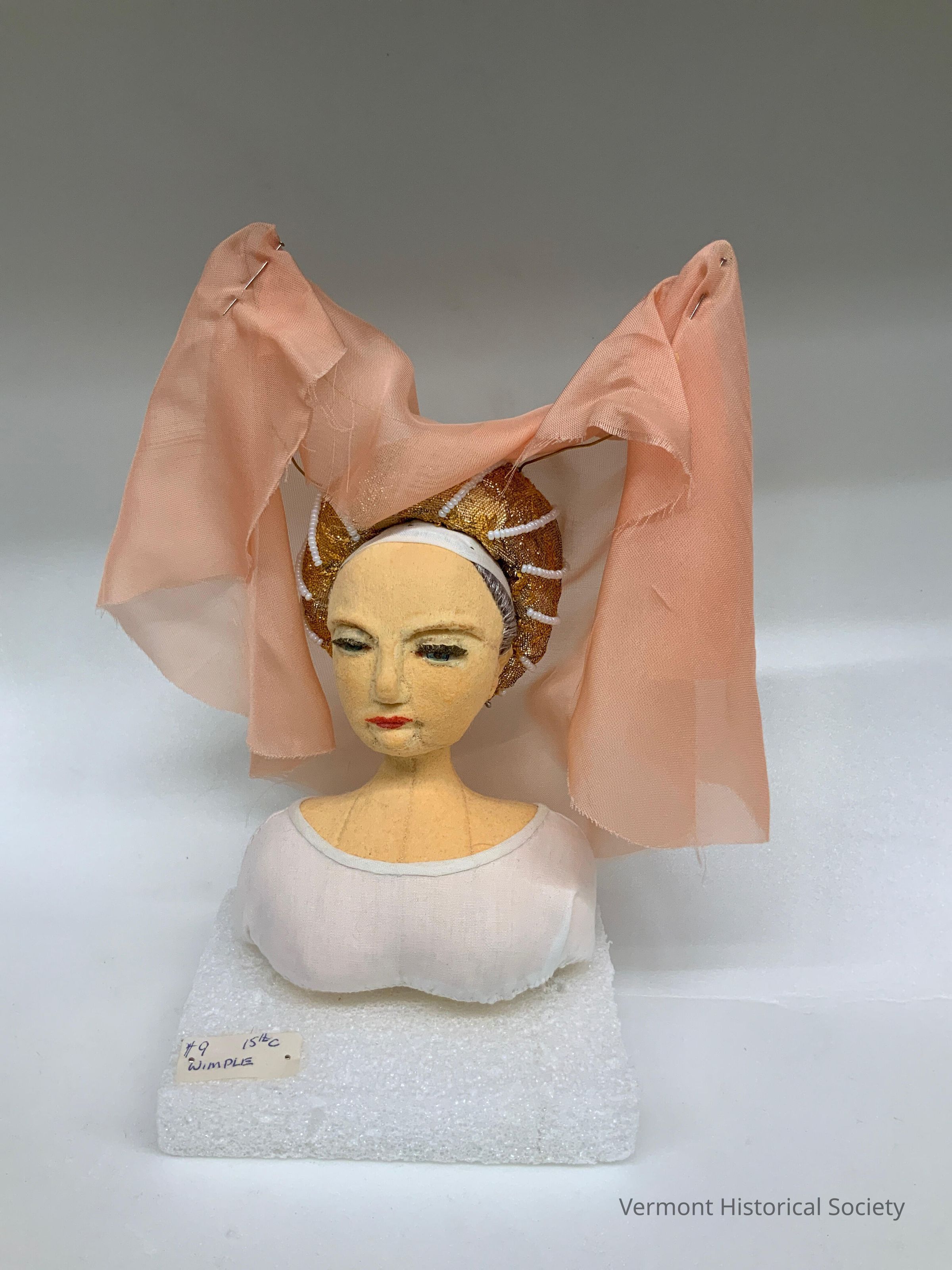 The bust is inserted into a Styrofoam base with two metal wires. The base has a paper label that reads, “#9 15thc wimple".Use