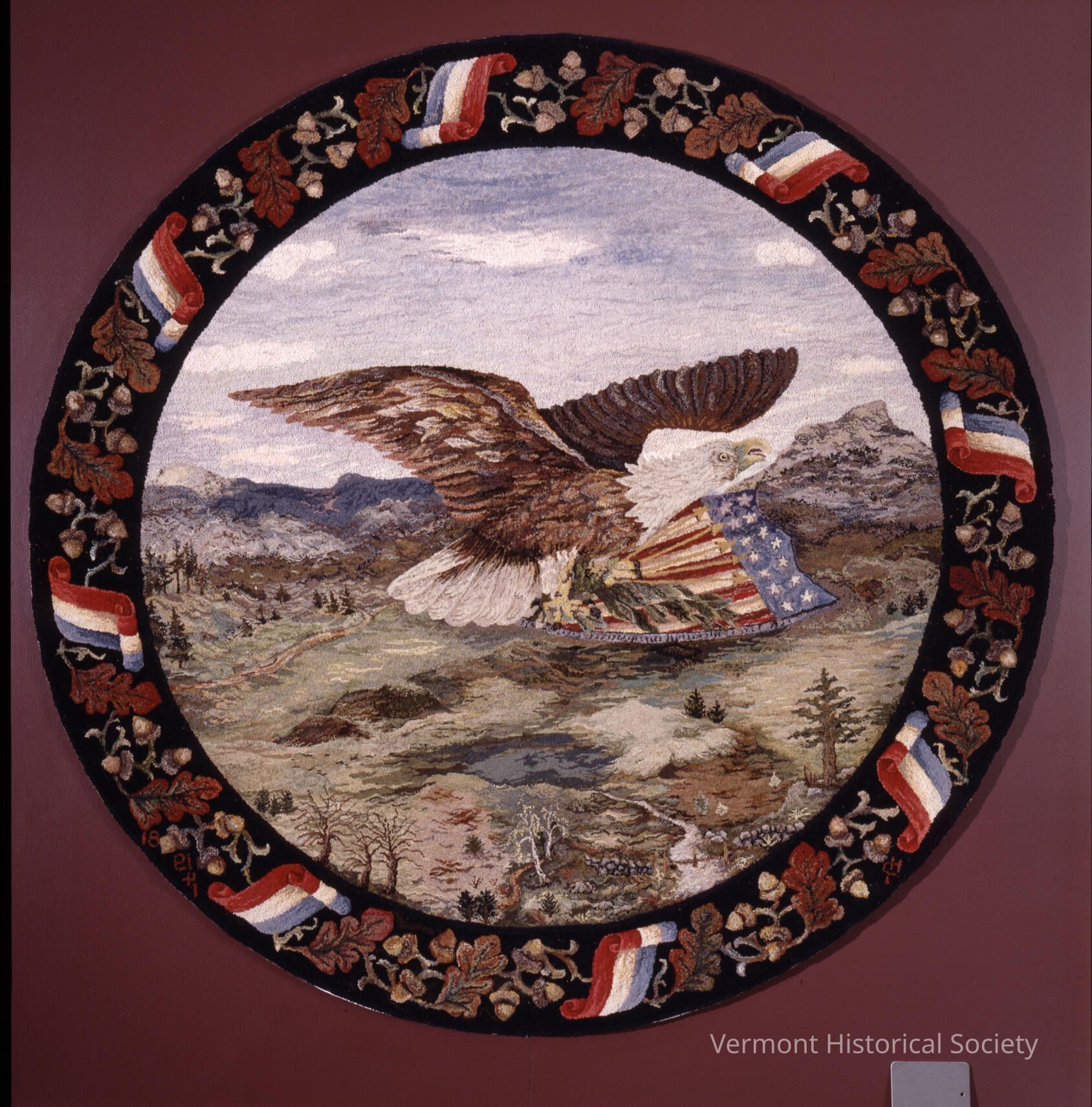 Vermont Union hooked rug. The central design of the rug features an eagle holding a shield and an olive branch in its talons. On the left side of the eagle is Camel's Hump and on the right is Mt. Mansfield. The rug has a border that is 7-1/2 inches wide, which is decorated with oak leaves and acorns, along with red, white, and blue scrolls. Behind the star area of the shield, two small pieces of fusing were applied to support the fabric, which had become weak after several years of use. On the lower right of the back of the rug, there is a tag sewn on that reads: "Vermont Union Rug / Frost Pattern #5 Charlotte Stratton / Mrs. Helen Tracy / 112 Washington Street / Barre, Vermont 05641".Context