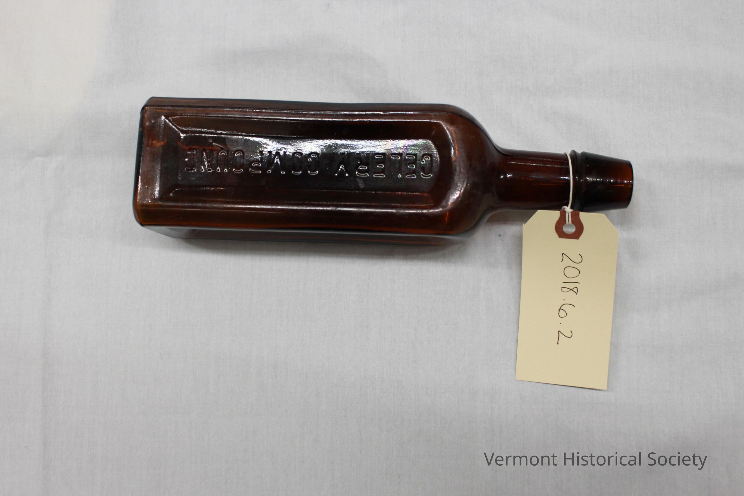 Tall, brown glass bottle with a square base. The sides of the bottle are molded with the inscriptions, "PAINE'S" and "CELERY COMPOUND".Context