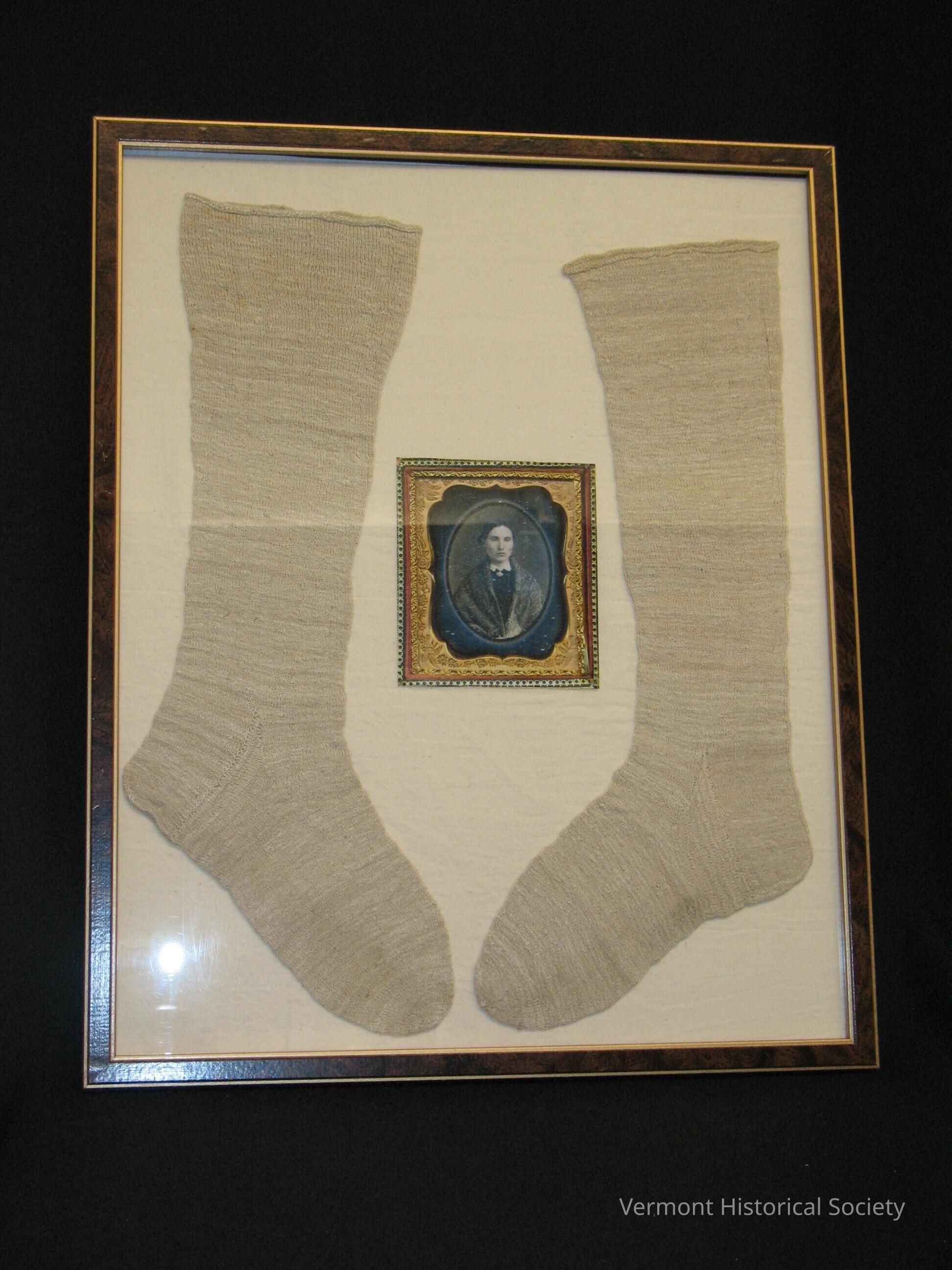 Two knit silk stockings or socks framed with a copy of a daguerreotype. The stockings are knitted in the round and shaped at the heel. They flare toward the top opening, and both roll down slightly at the top.