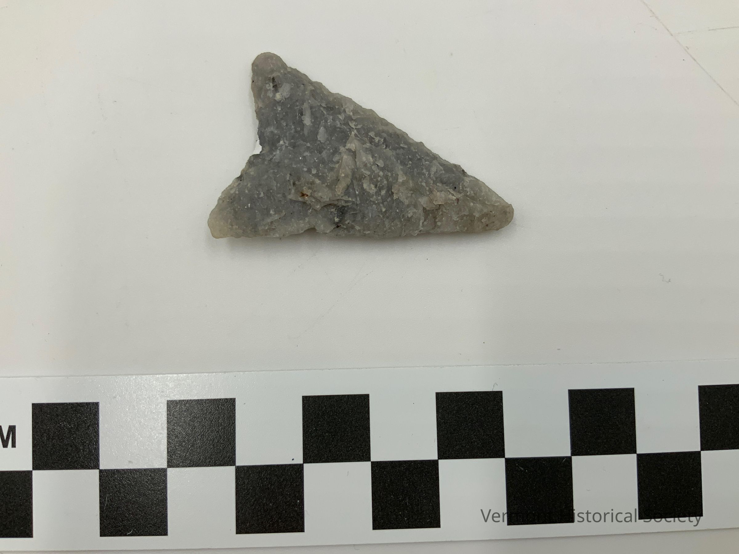 Triangular grey chipped stone projectile point. The base curves inward in a V-shape.