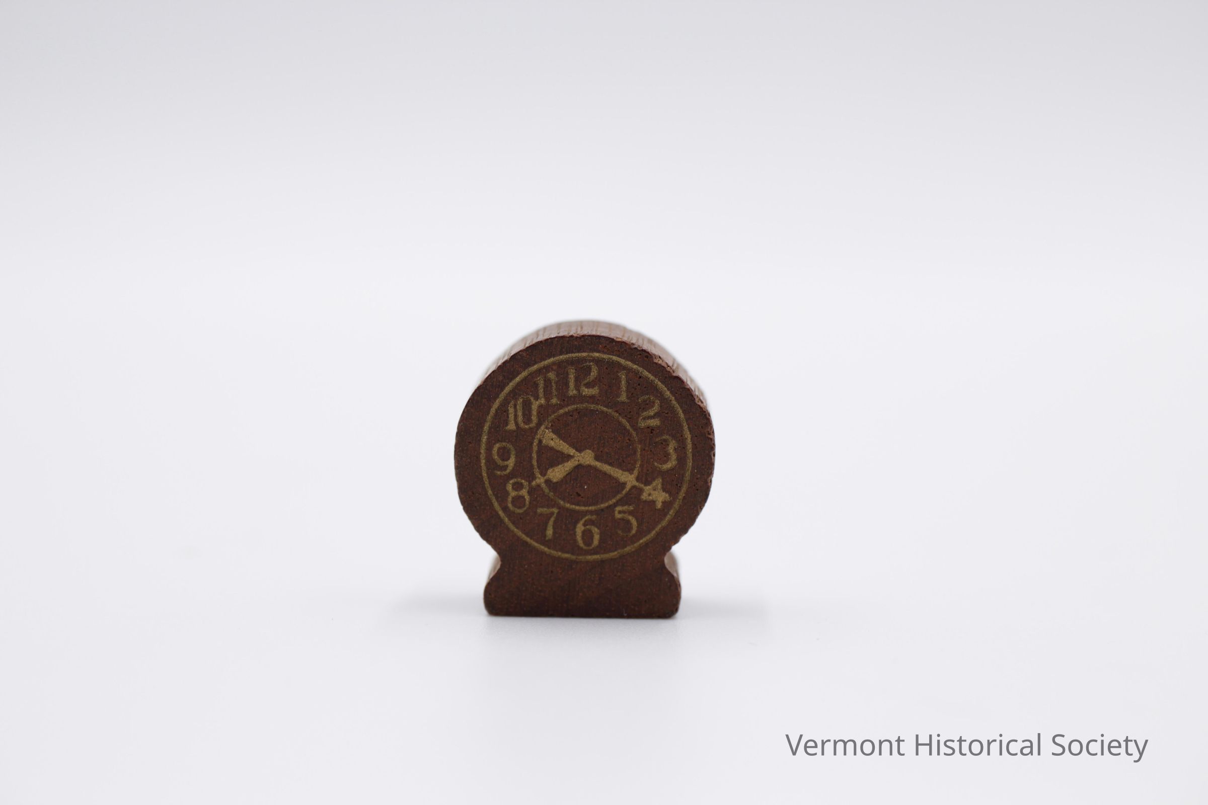 Miniature wooden mantel clock sized for a dollhouse. The front is stamped in yellow with a clock face with Arabic numerals. The hands are indicating a time of 9:40:20.Context