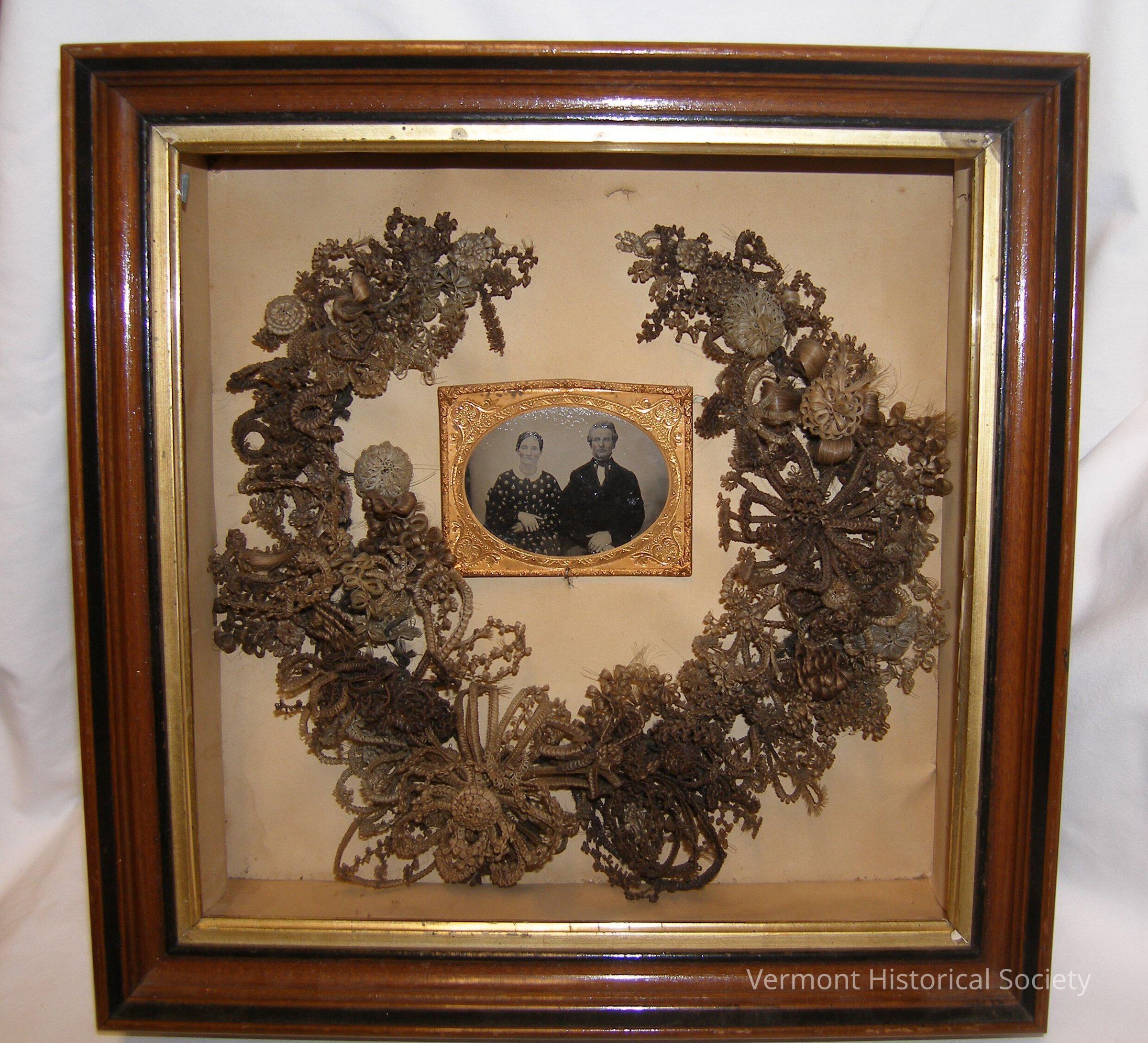 Hair wreath with tintype of John & Nettie Dodge of Barre, VT. Wooden shadow box with hair wreath in the shape of a rounded horseshoe (opening at the top), the inside most band, closest to the glass is of gold/gilt and there are two bands painted black. In the center is a tintype of a woman & man in a gold colored fillagree frame-like mat. Paperboard back is stapled to the back of the piece.