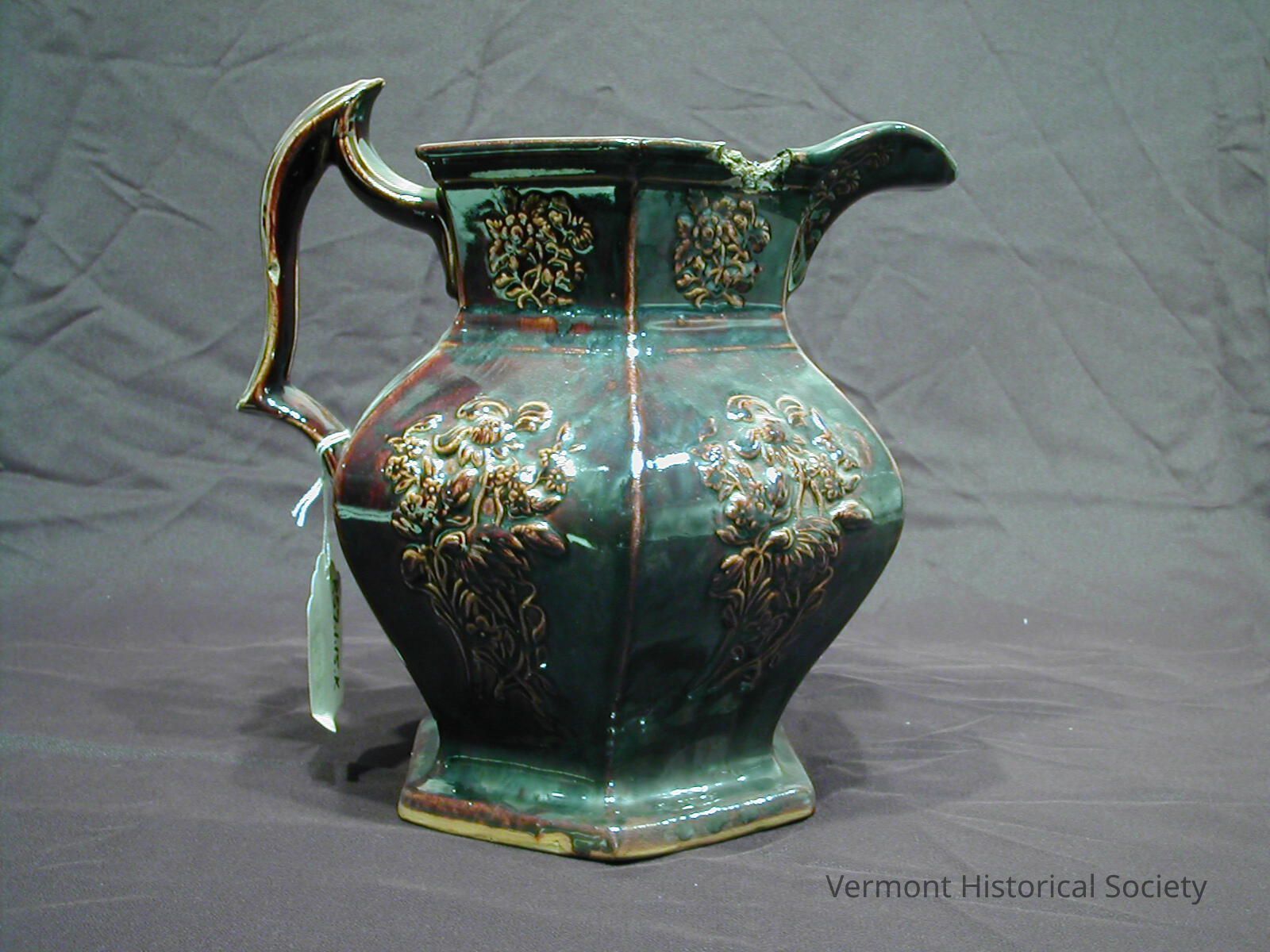 Faceted pitcher with semi-gloss black and red glaze. The pitcher is shaped into 6 facets, each with the molded decoration of a floral stem on the bottom and a smaller floral stem on the top. The handle arches upward into a point that extends higher than the rim of the pitcher. The bottom is left unglazed and stamped with the mark, "NORTON & FENTON, East Bennington, Vt".