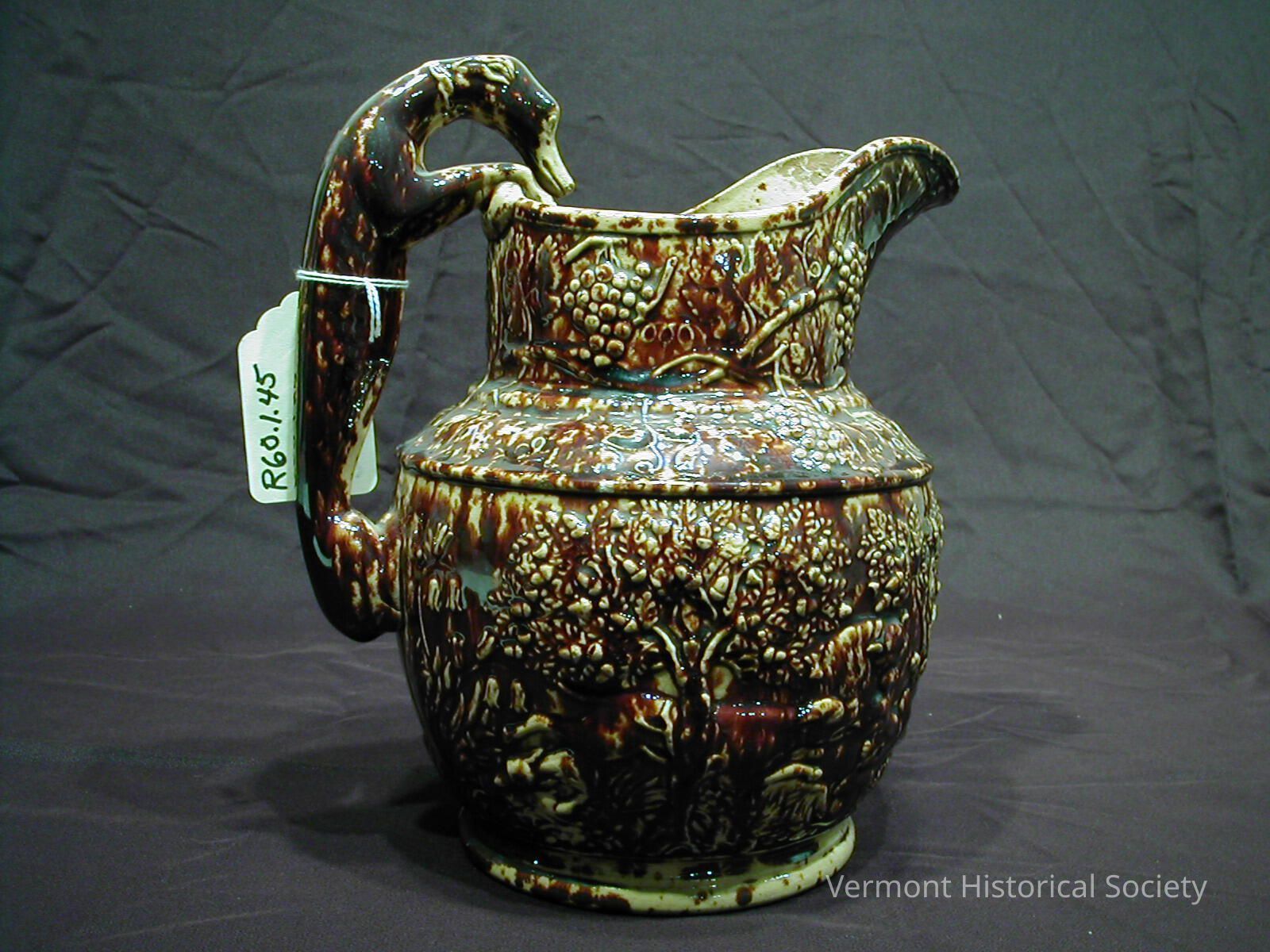 Large pitcher with mottled brown Rockingham glaze decoration. The round body of the pitcher is molded with hunt scene, including trees, rocks, and a stag. The shoulder and neck are molded with a grape vine design. The handle is molded into the shape of a hound whose nose is pointed downward into the pitcher.