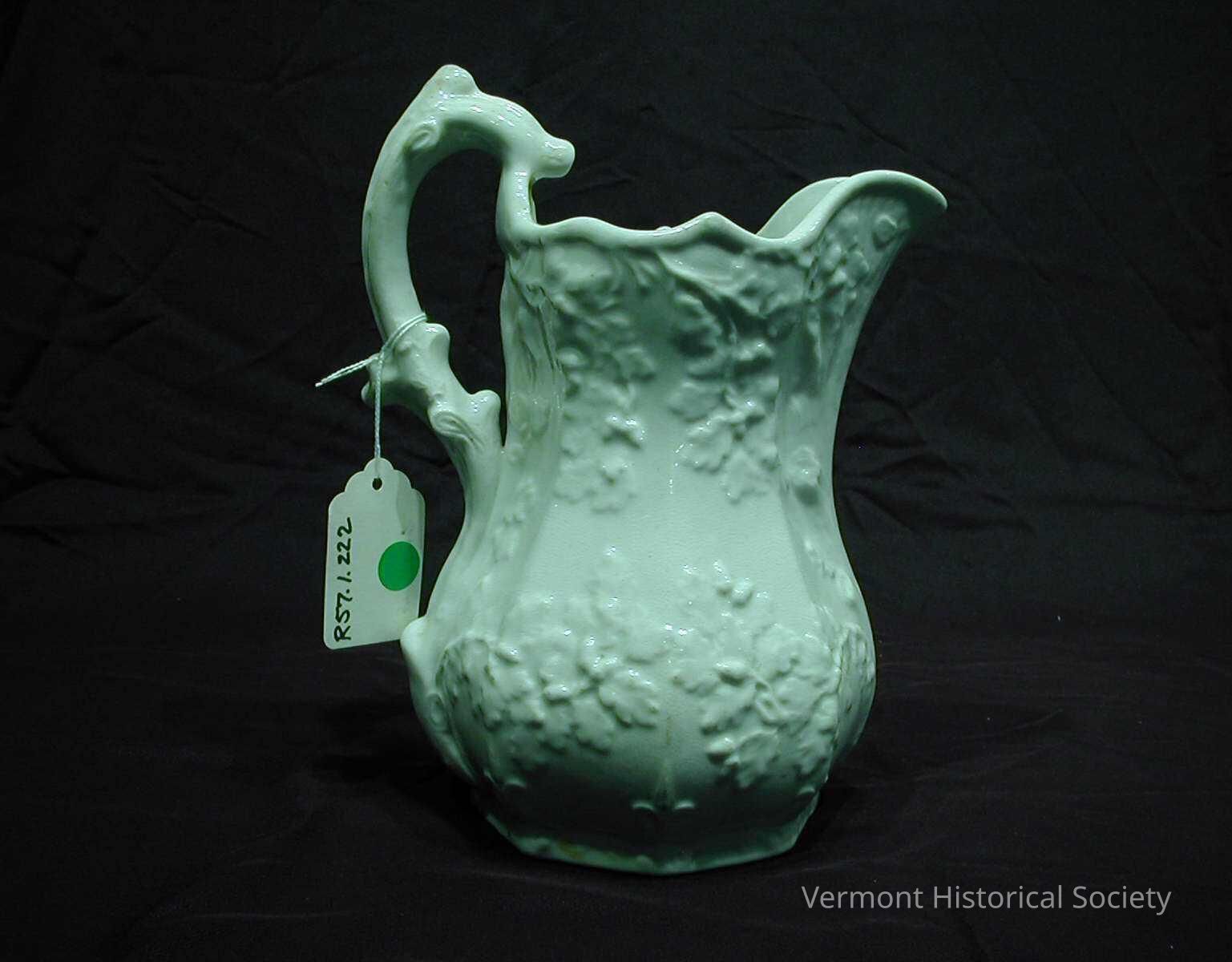 White glazed pitcher with molded design of ivy or oak branches. The handle is in the shape of a knobbed branch. The piece is marked on the bottom with "U.S. P." and an illegible number on a twisted ribbon.