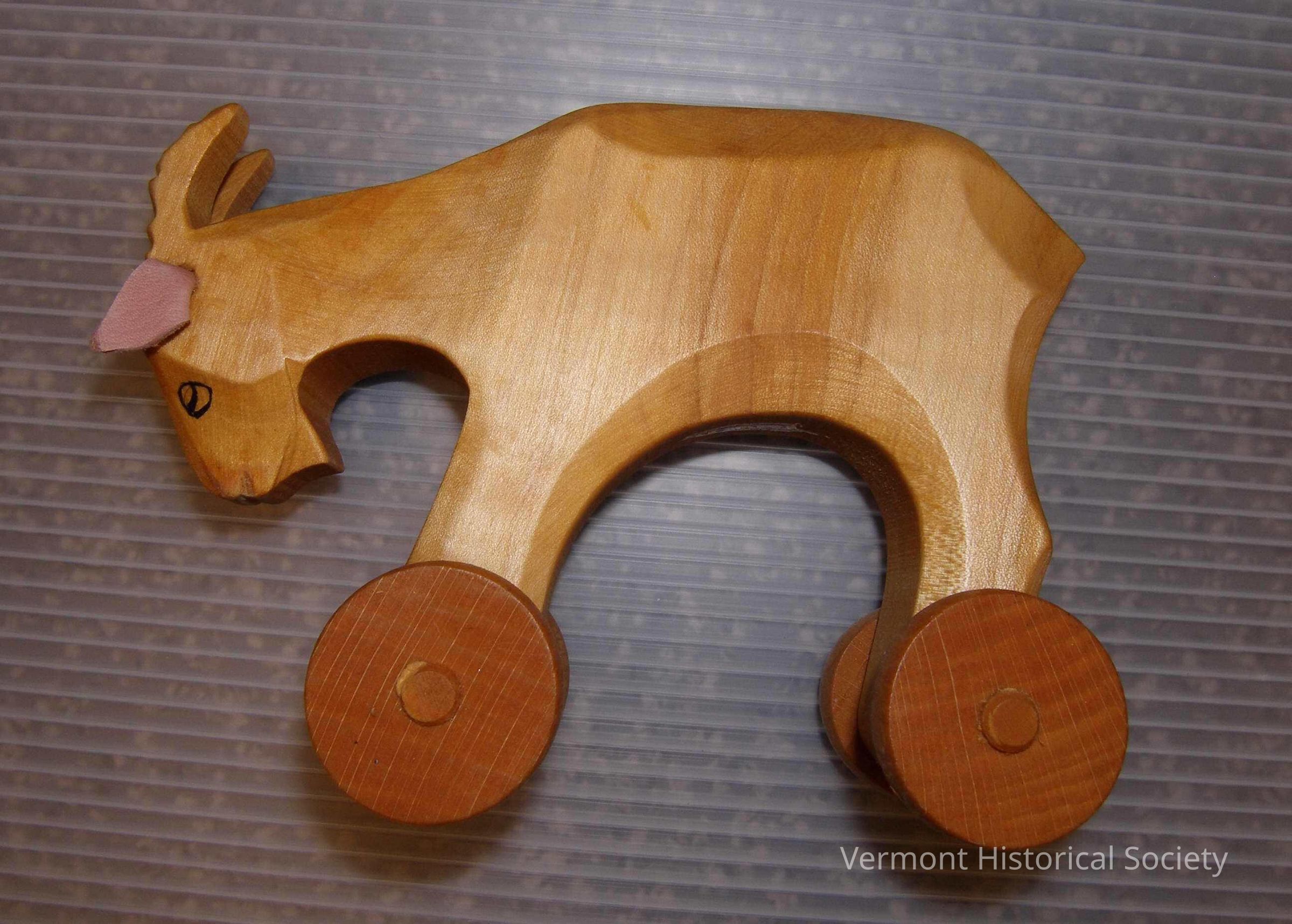 Carved wooden goat on wheels. The goat has two legs, front and back, with wheels mounted on either side. There are drawn-on eyes and the ears are leather.