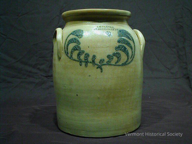 Tan stoneware crock with a cobalt glaze decoration of fern leaves or feathers. At the top center of the crock is the stamped inscription, "L.W FENTON / ST.JOHNSBURY.VT." above the number 2. The crock is straight-sided with a flared lip. There is a U-shaped handle attached on either side. The inside of the crock is a dark brown.