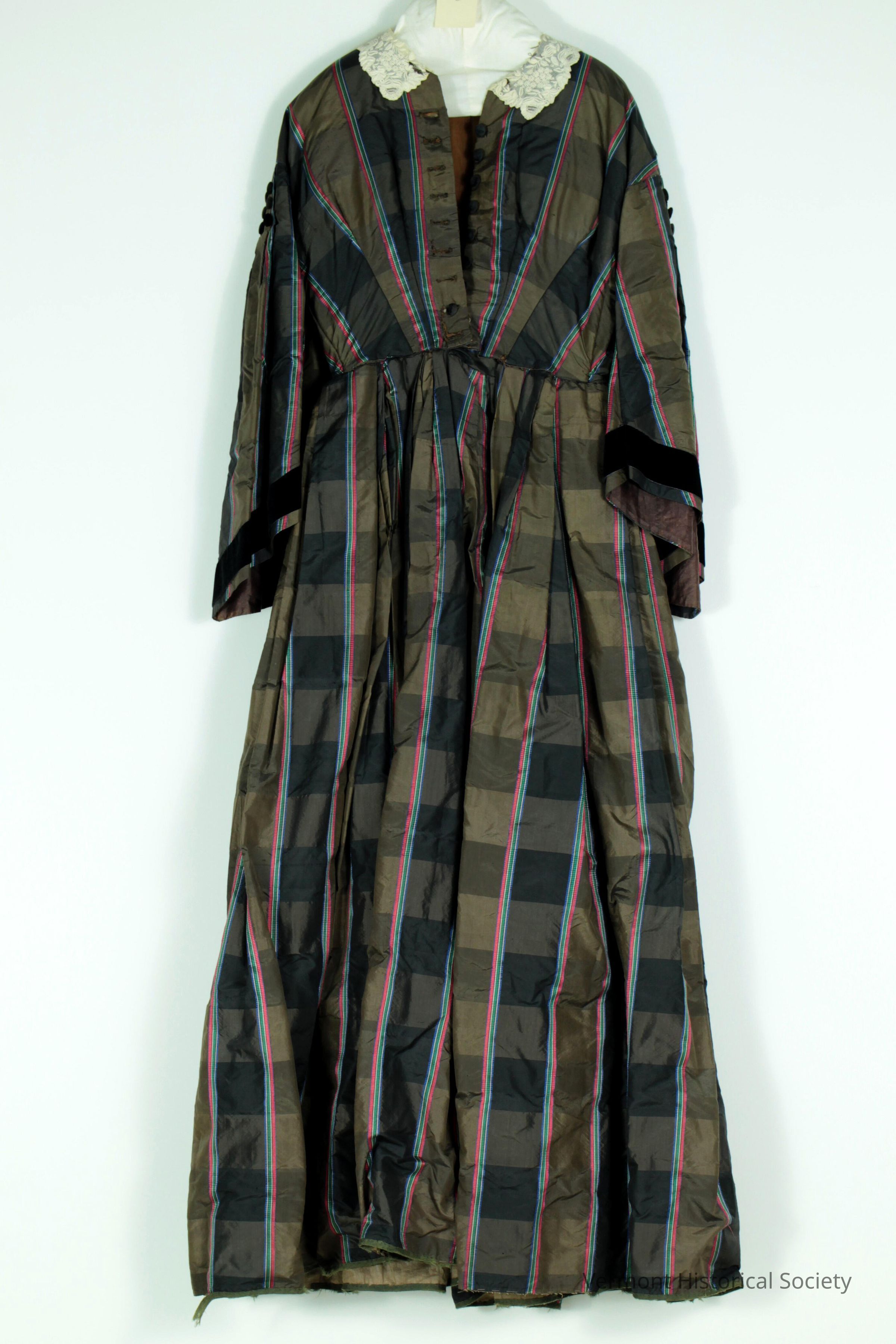 One-piece dress of brown and black check accented with red and green stripes. The neckline has a fall collar of white lace. The pagoda sleeves are accented at the top by twelve velvet buttons. The bodice opens up the center front and secures with nine velvet buttons. Both the skirt and bodice are lined with buckram, and the skirt has been lengthened two inches from the waist.