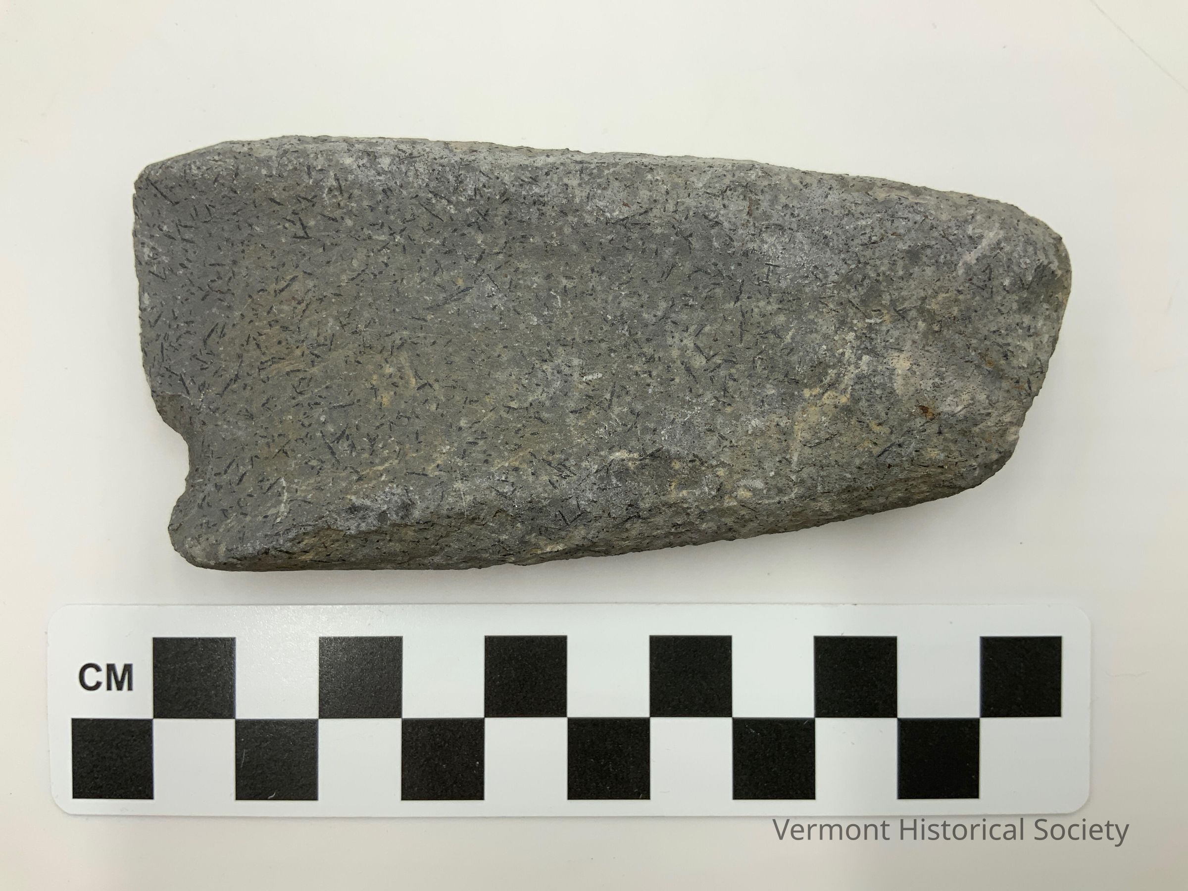 Ground stone gouge made of hornfels. The entire surface is pecked. The distal blade end is ground and polished. There is a shallow groove on one side.Context