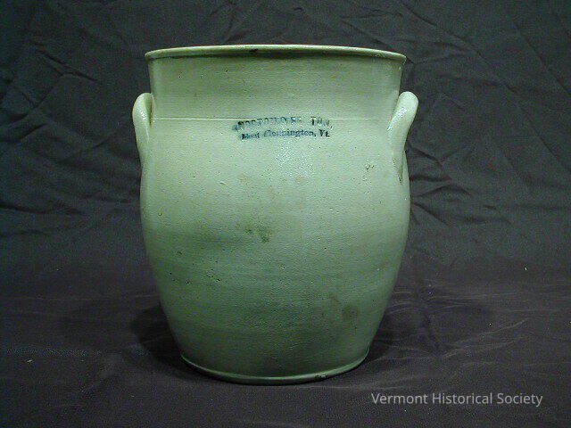 Stoneware crock with white body and dark glazed interior. The form flares slightly in the middle, comes back in, then flares again at the lip. U-shaped handles are applied onto either side near the top, and a line is scored around the piece at the midpoint of the handles. The inscription, "NORTON & FENTON/East Bennington, Vt." is impressed into the center front on the scoring line, and colored blue (underglaze).Context