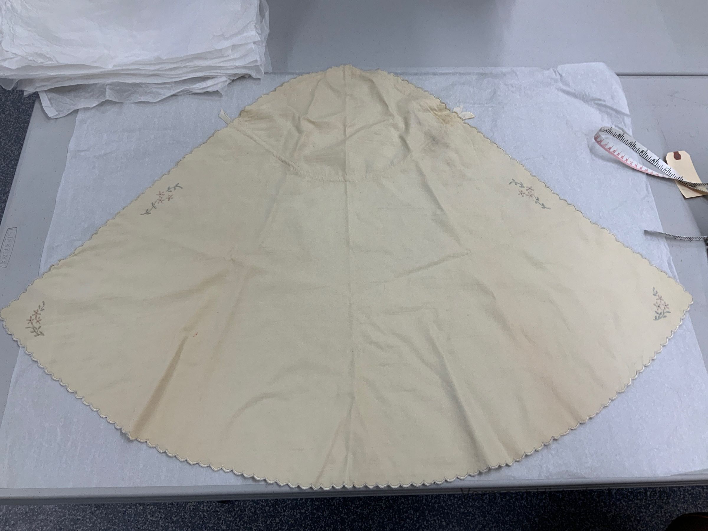 Cream-colored wool cape with cream-colored silk lining. It is triangular in shape with a rounded corner at the top to form a hood. There are 2 ribbons to gather the hood. It has blue and pink embroidery on the 2 lower corners and halfway up the sides. The edges are scalloped and finished with blanket stitches. It is sized for an infant.Context