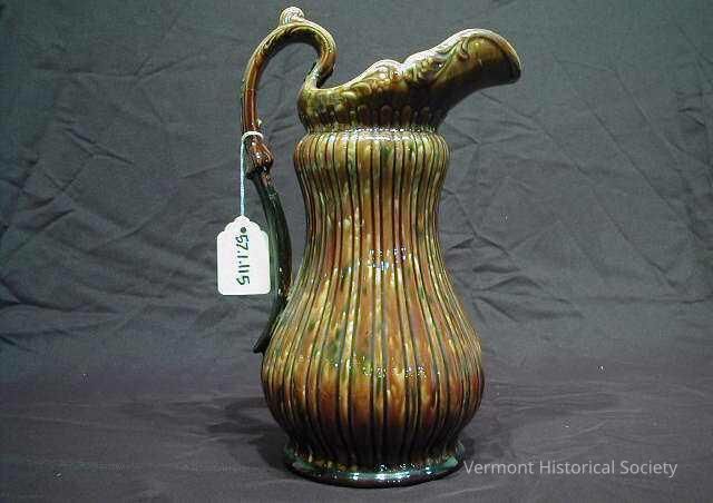 Tall ceramic wash pitcher with mottled brown and green glaze. The body is molded with flutes and there is scrollwork around the rim. The bottom is stamped with the mark, "Lyman Fenton & Co. Fenton's enamel patented 1849, Bennington, Vt."