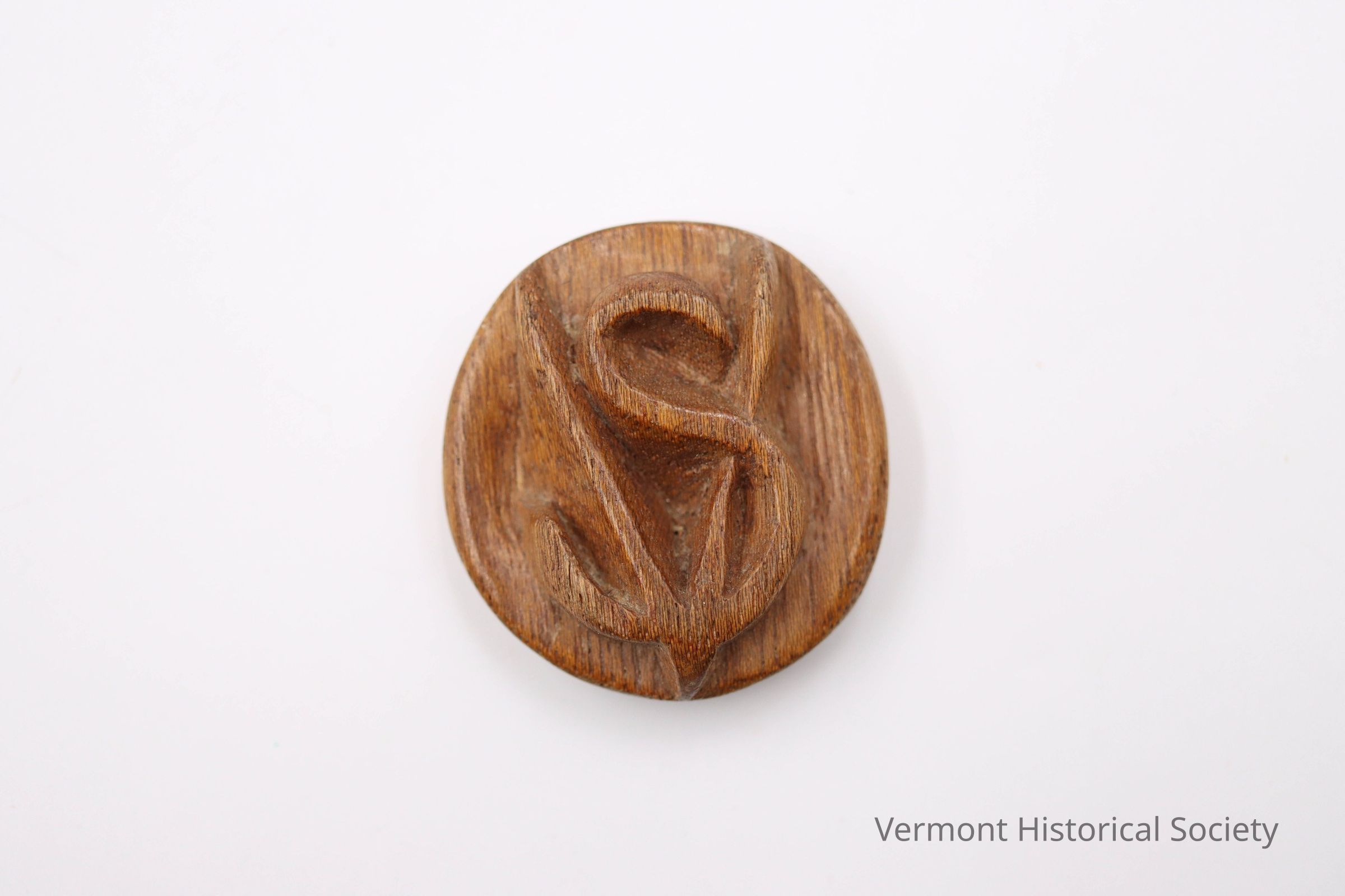 Small round wooden medallion carved with raised, intertwined letters "VS".