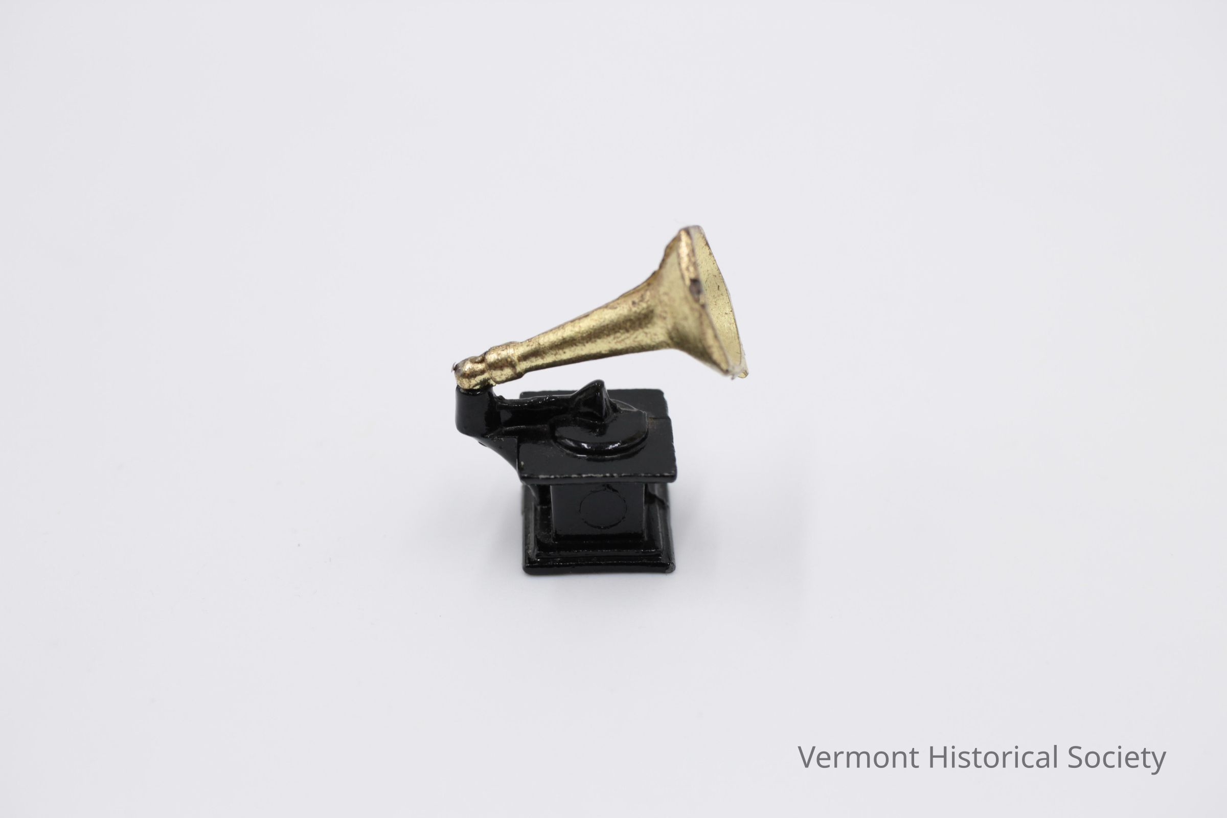 Miniature metal gramophone consisting of a black painted base and gold painted horn. The base is square and is molded to show a record on the top. The horn is above the base and is tilted at an upward angle.Context