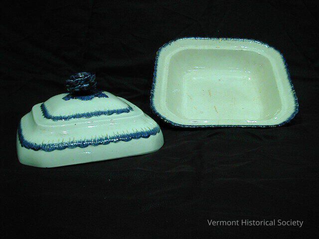 Shell-edged covered dish with rose handle. The dish is square with shallow, incised lines around the edges, painted blue. The lid echoes the edges of the dish around the rim and around the center. At the very center is a molded rose sitting atop a bed of leaves, all painted blue.