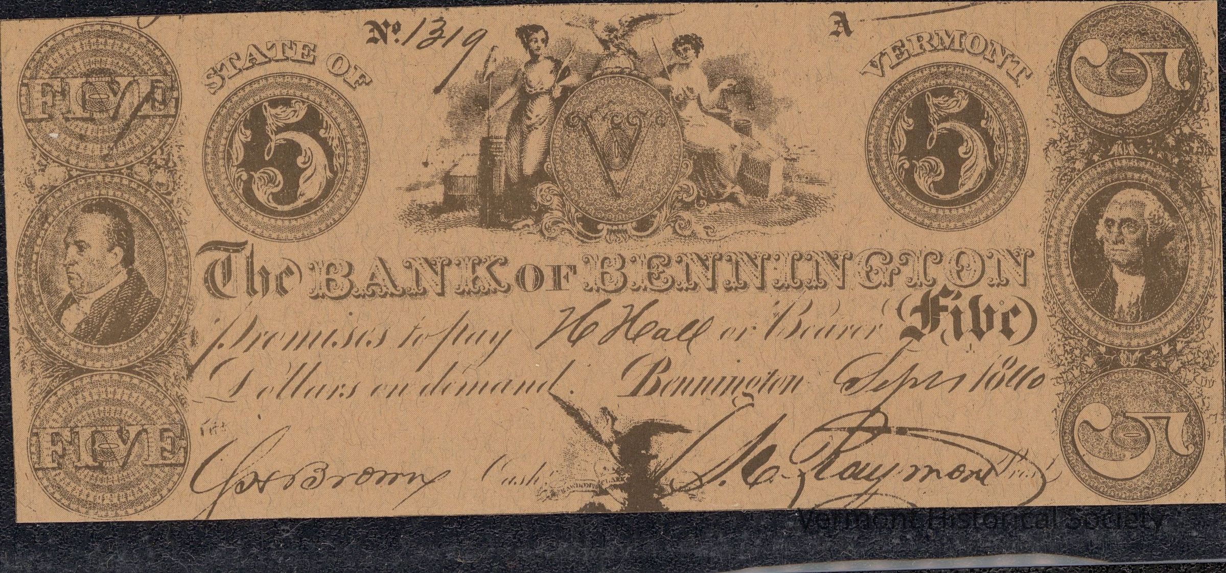 Modern reproduction of a private bank note for 5 dollars from The Bank of Bennington. The serial number is 1319, and it is made out to H. Hall. It is dated Sept. 1840.