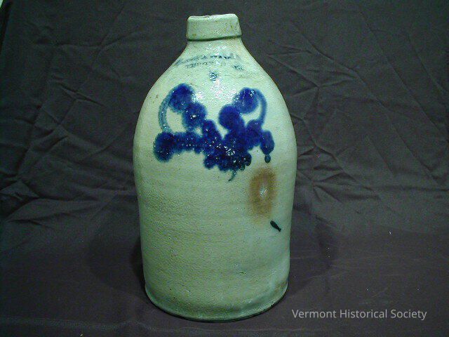 Stoneware jug with hand painted design of curled fern leaves or feathers. Above the design is the stamped label, "FENTON & HANCOCK ST. JOHNSBURY. VT. 2".
