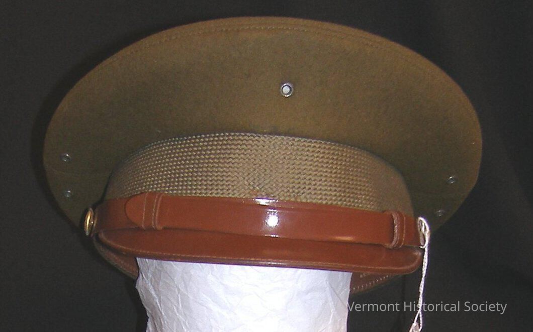 Undecorated olive green service cap with shiny brown leather brim. The interior is lined with nylon and has the label, "BANCROFT Military Caps".