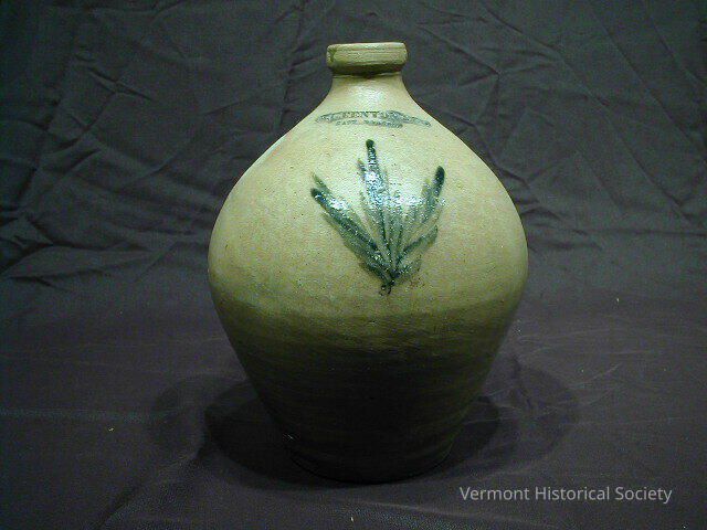 Stoneware jug with cobalt glaze design of three feathers or leaves. There is a small round handle at the back of the spout. The center top is stamped with the label, "R. L. FENTON & Co. / EAST DORSET."Context
