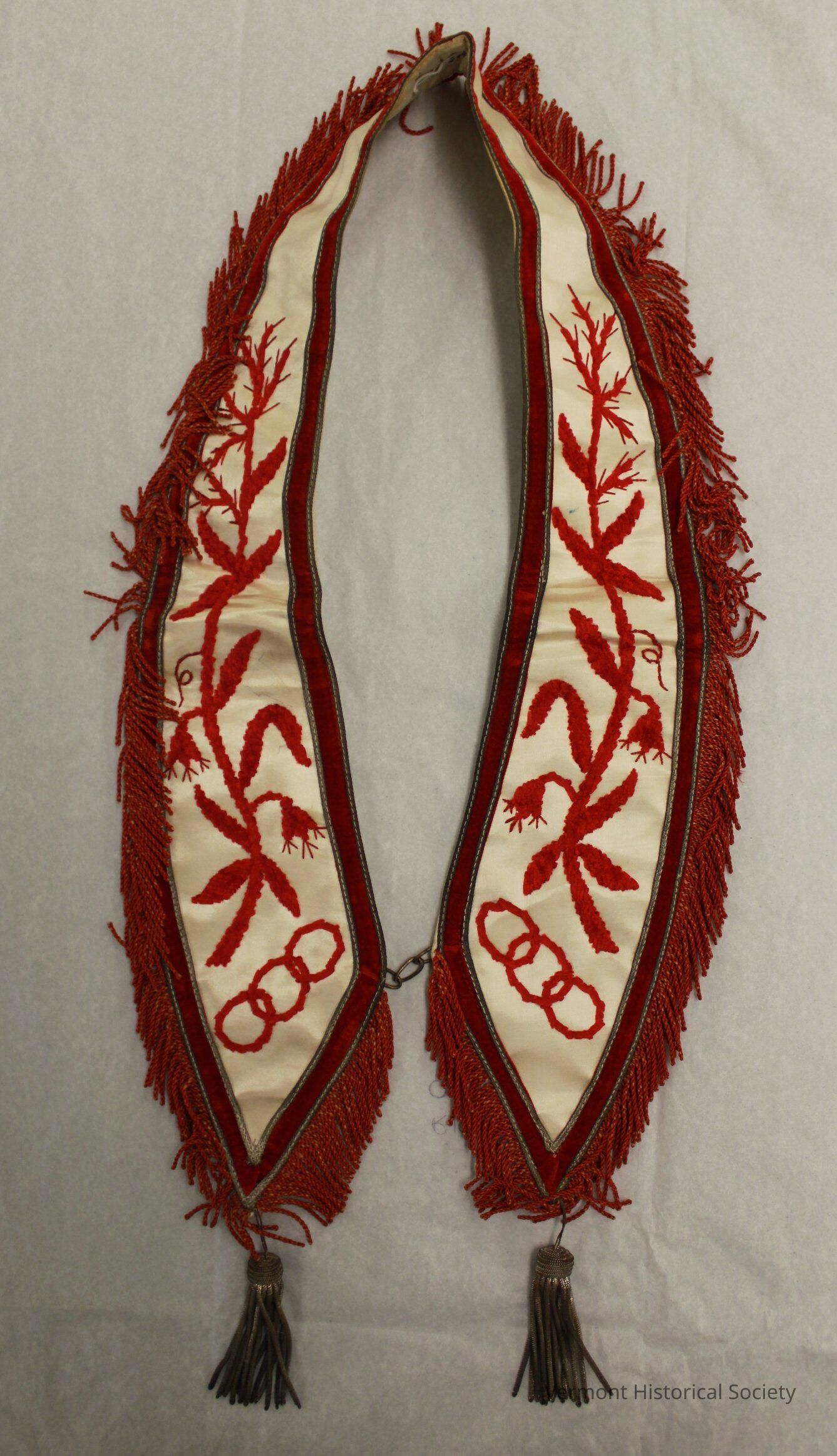 Ceremonial collar embroidered with Odd Fellows iconography. The long collar has a ground of white silk embroidered with red silk. The embroidery is of a bellflower plant and three chain links. The outer edge is decorated with red silk fringe. Two large tassels hang from the collar points.