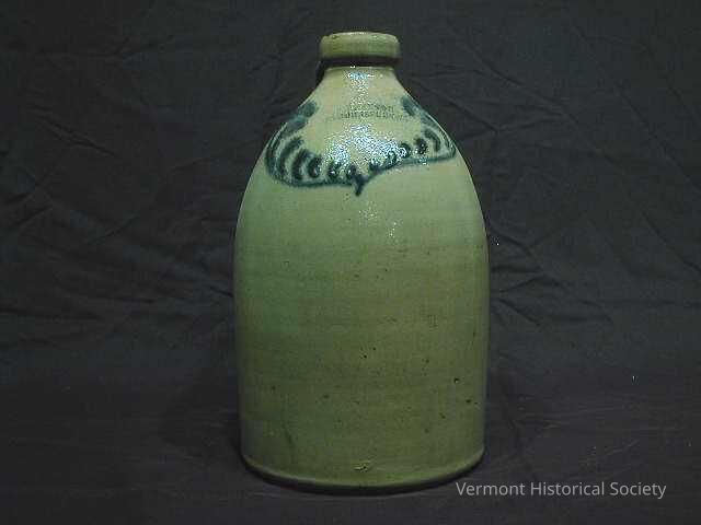 Stoneware jug with U-shaped handle at the back of the spout. The front is decorated with either antlers, feathers, or fern leaves. Within the decorative shape is the stamped label, "L. W. FENTON / ST.JOHNSBURY.VT."Context