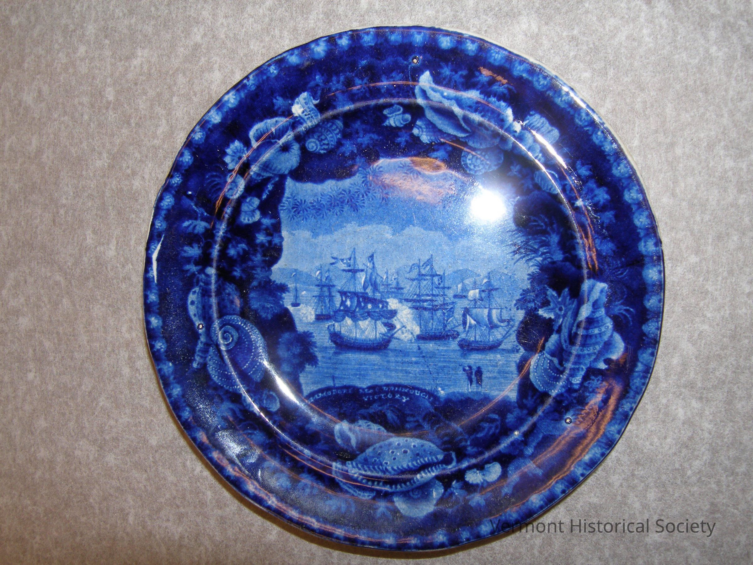 Blue and white transfer printed dessert plate. The center is printed with a scene of a naval battle with several tall ships. Mountains and clouds can be seen in the background, and two men look on the foreground above the label, "Commodore MacDonough's Victory". The border is printed with shells and seaweed. The reverse is marked, "31".