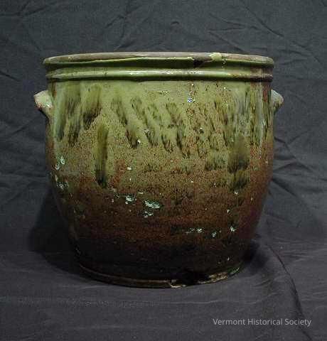 Ceramic jardinière with glazed interior and exterior. The exterior glaze is red on the bottom and green with black streaks on the top.Context