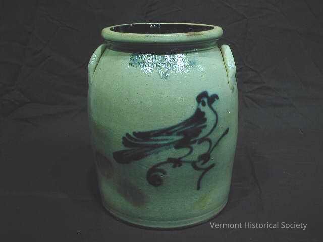 Stoneware crock with a cobalt glaze decoration of a bird on a branch. There are U-shaped handles on either side. At the center top of the crock is the stamped label, "J. NORTON 7 CO. / BENNINGTON, VT. / 1 1/2."