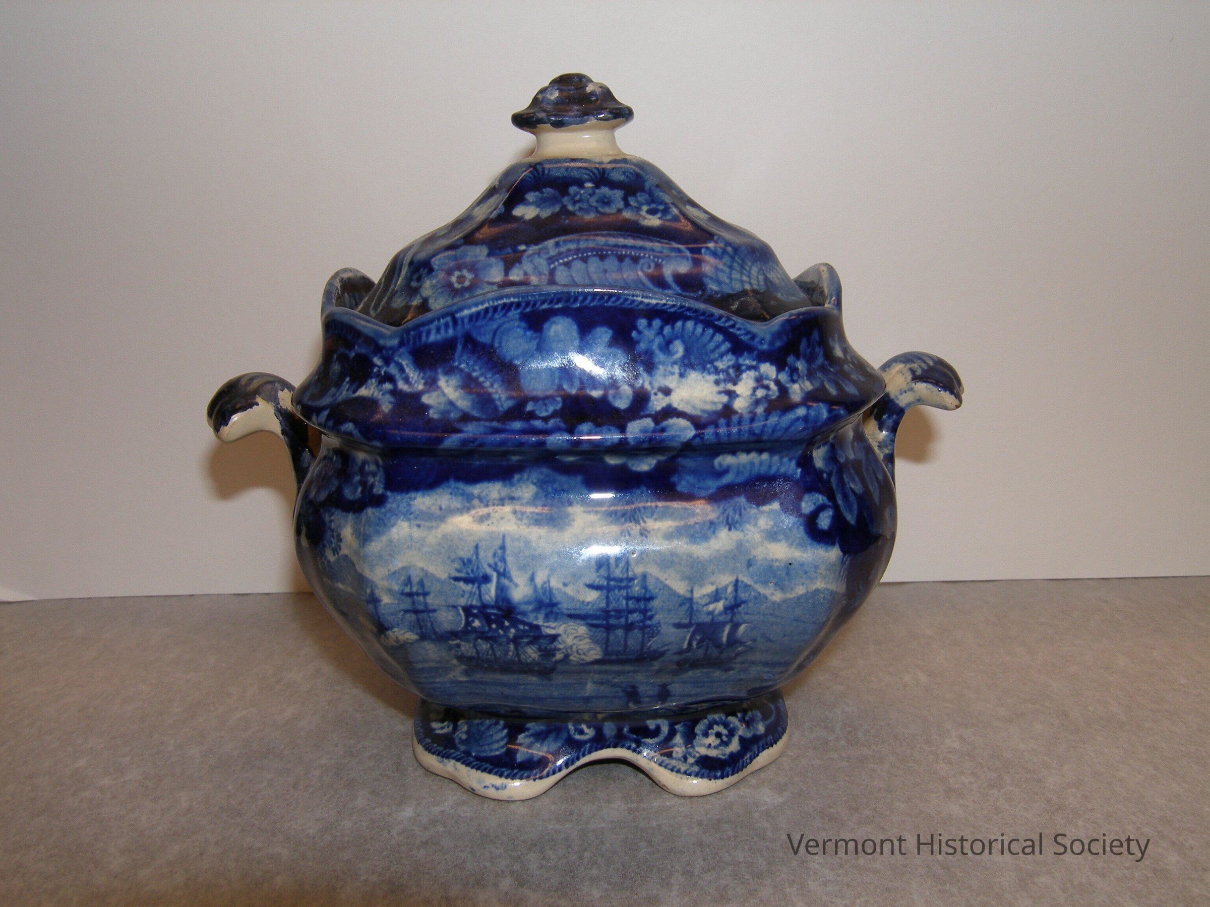 Blue and white transfer printed sugar bowl and lid. The sides of the bowl are printed with a scene of a naval battle with several tall ships. Mountains and clouds can be seen in the background, and two men look on the foreground above the label, "Commodore MacDonough's Victory". The bowl rim, base, and the lid are printed with flowers.