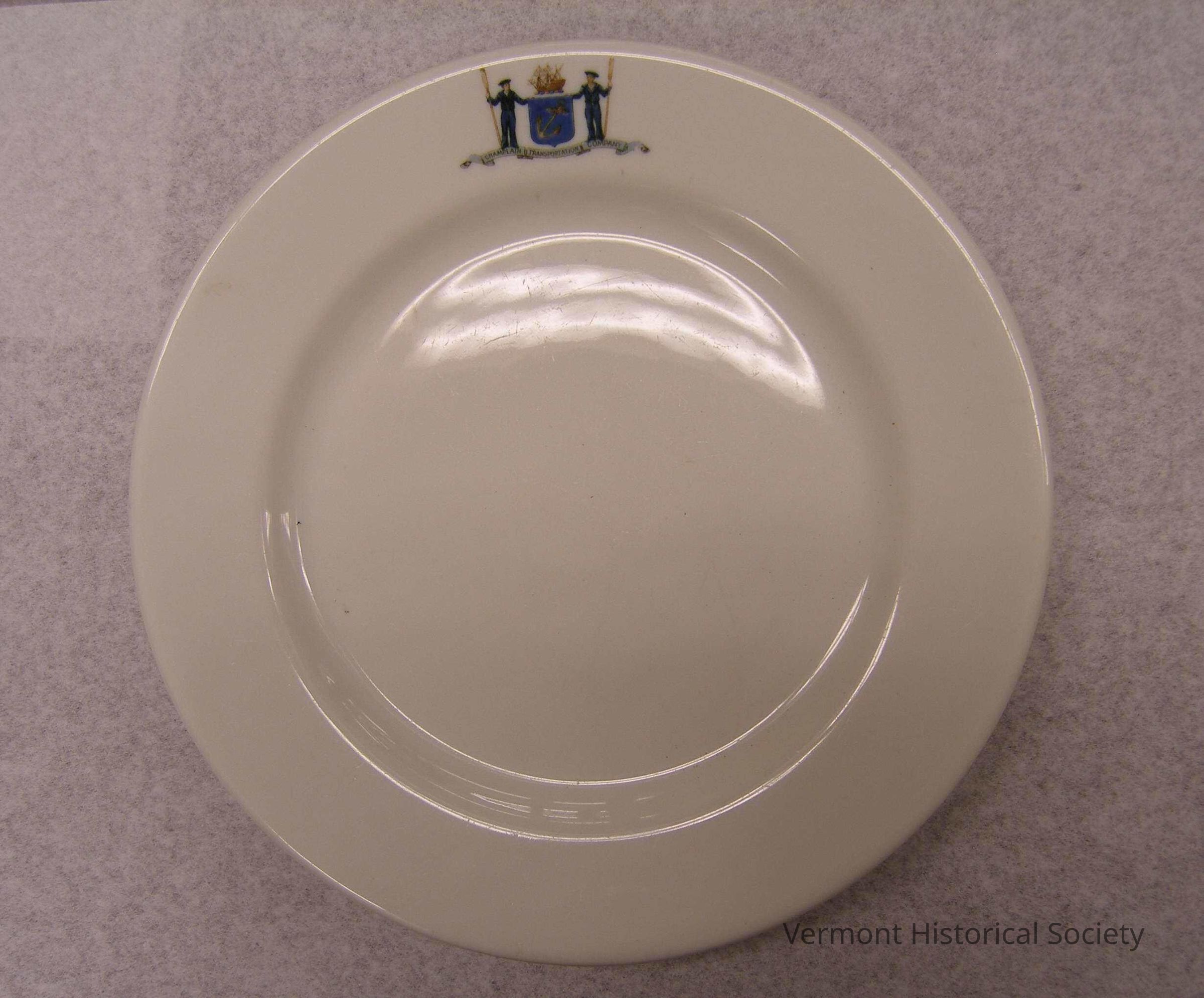 Heavy white ceramic dessert plate. The round plate has a raised rim that is printed with an armorial image consisting of two figures in sailor suits holding oars in the outer hands and a banner between them. The shield-shaped banner has a yellow anchor on a blue ground. Above the banner in a three-masted ship with sails furled. Below the image is a ribbon or banner with the inscription, "CHAMPLAIN TRANSPORTATION COMPANY". The reverse has the green mark, "O.P.CO. SYRACUSE CHINA I-3".