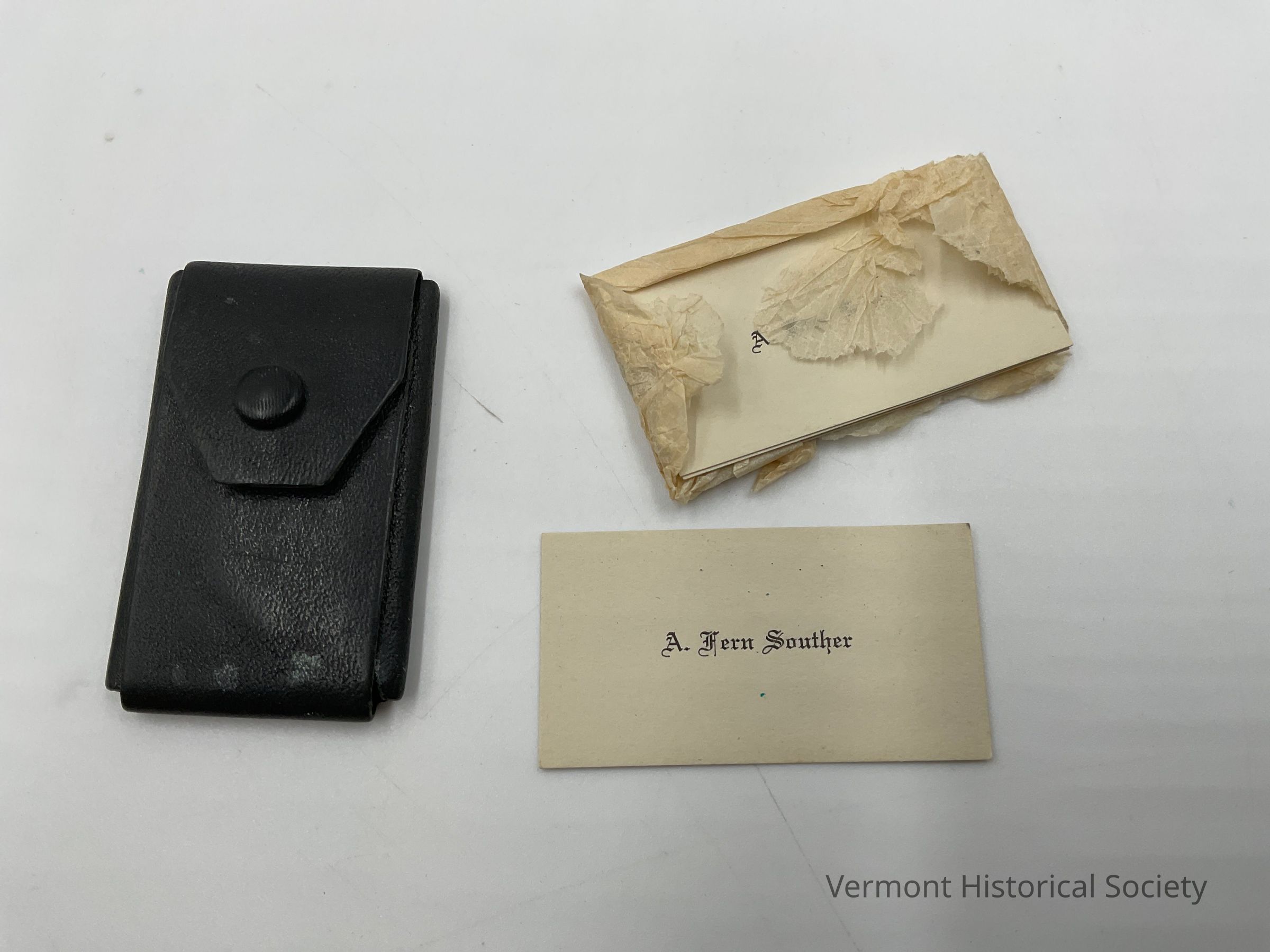 Small black case that snaps shut plus a small packet of calling cards with the name, "A. Fern Souther" printed in a fancy typeface, small in size, in the center of each card. There are four cards and some tissue that wrapped them.