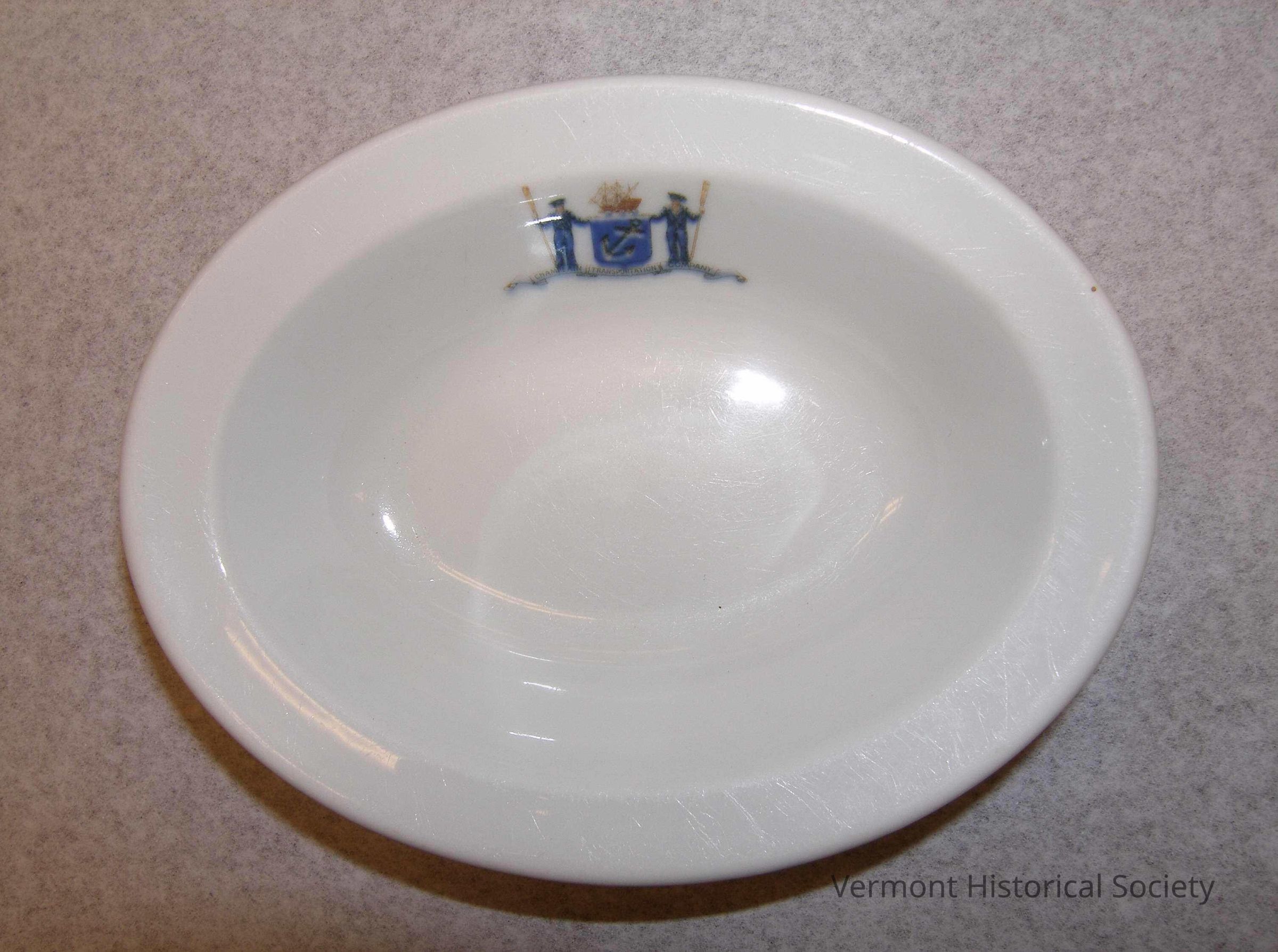 Heavy white ceramic bowl. The oval bowl has steeply raised sides and a wide rim. The side is printed with an armorial image consisting of two figures in sailor suits holding oars in the outer hands and a banner between them. The shield-shaped banner has a yellow anchor on a blue ground. Above the banner in a three-masted ship with sails furled. Below the image is a ribbon or banner with the inscription, "CHAMPLAIN TRANSPORTATION COMPANY". The reverse has the green mark, "O.P.CO. SYRACUSE CHINA F-3".