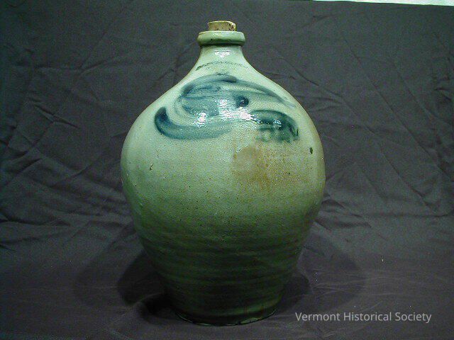 Large stoneware jug with hand-painted decoration of a bellflower. The small opening is sealed with a cork and a handle attaches to the back of the lip. The center of the neck is stamped with the label, "R. L. FENTON & Co. EAST DORSET. 2".Context