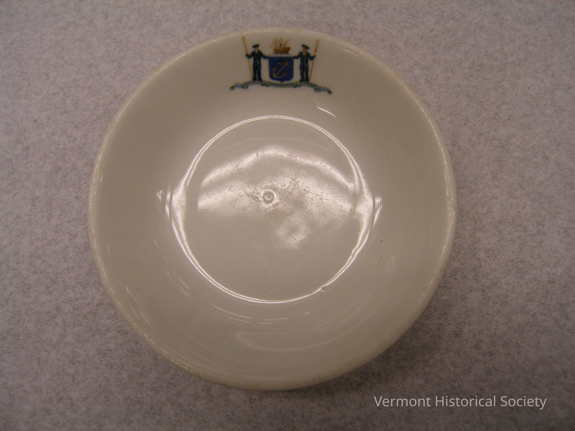 Small white ceramic bowl. The round bowl has a curved rim that is printed with an armorial image consisting of two figures in sailor suits holding oars in the outer hands and a banner between them. The shield-shaped banner has a yellow anchor on a blue ground. Above the banner in a three-masted ship with sails furled. Below the image is a ribbon or banner with the inscription, "CHAMPLAIN TRANSPORTATION COMPANY". The reverse has the green mark, "O.P.CO. SYRACUSE CHINA D-9".