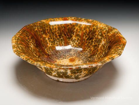 Slightly faceted washbasin with flared rim and mottled glazed decoration. The glaze is spotted with green and striped with orange. The bottom is marked, "Lyman Fenton & Co. / Bennington, Vt. / Fenton's ENAMEL PATENTED 1849."Context