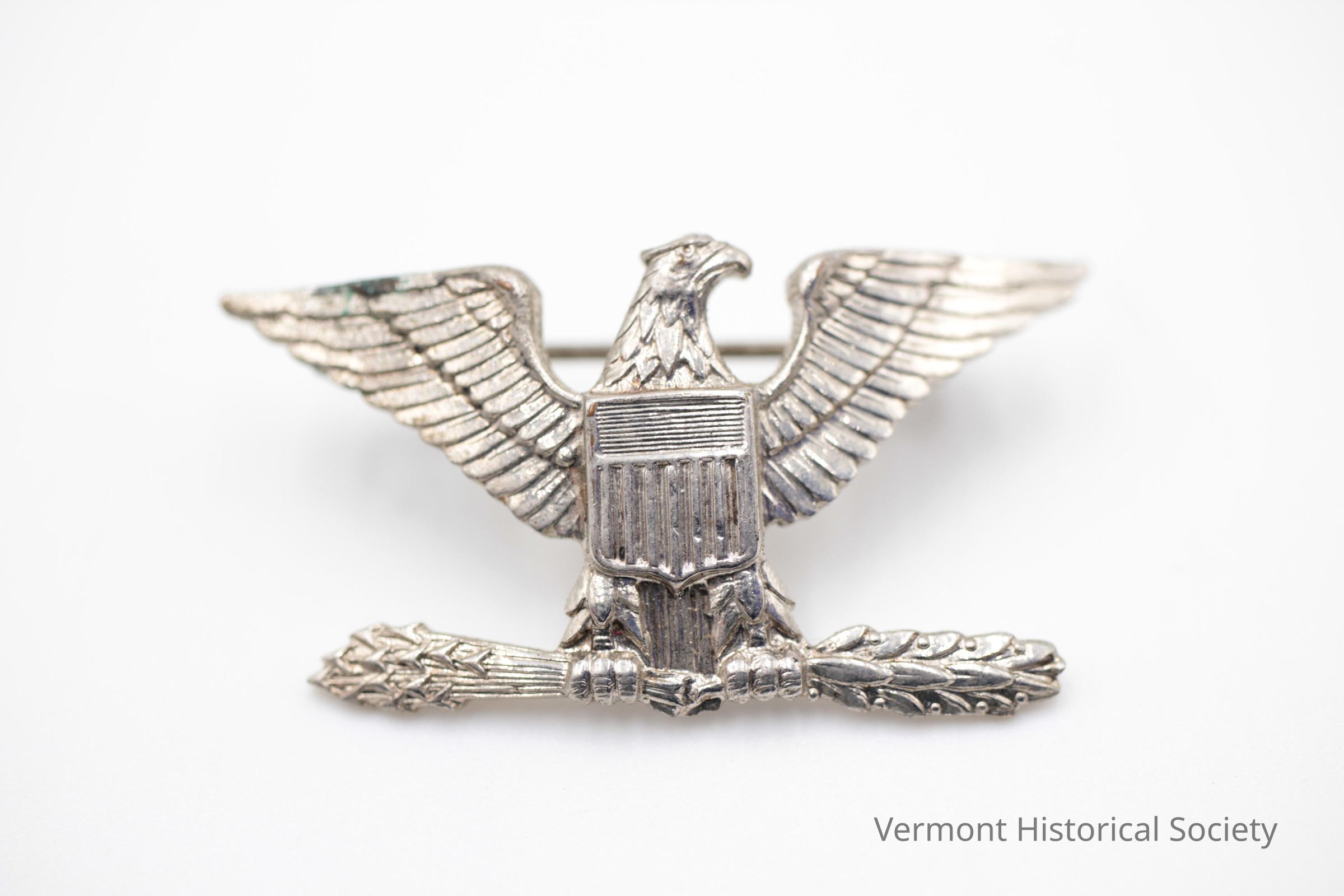 Silver pin of an eagle clutching arrows and wheat. There is a safety style pin across the back.