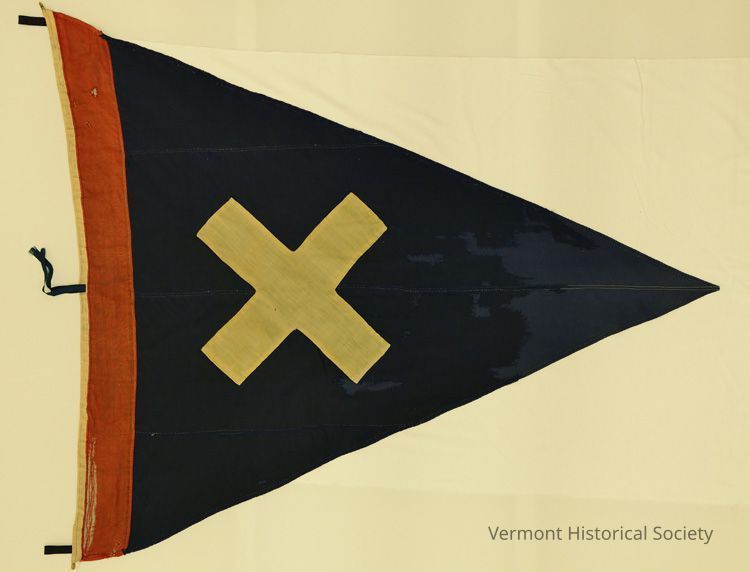 2nd Brigade, 2nd Division, 6th Corps brigade guidon. Triangular in shape, white Greek cross. Attached to staff with blue worsted ties.