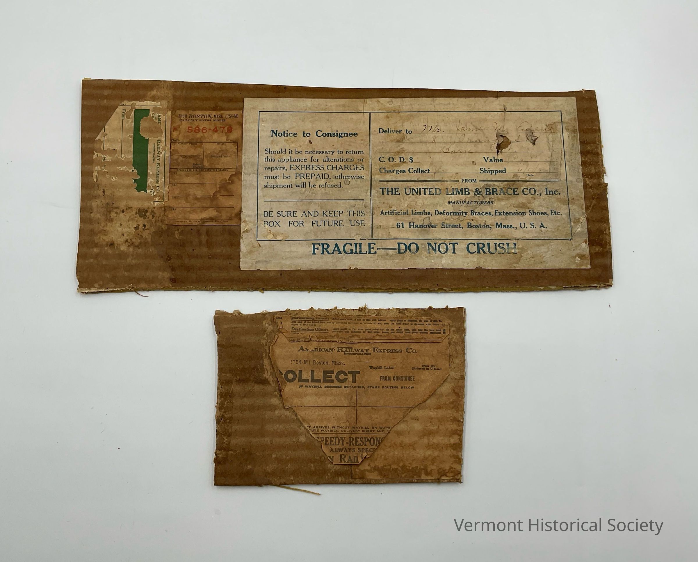 Shipping label for a prosthetic right leg owned by James M. Ewen of Barre in the 1920s(?). The prosthesis is made up of a foot/calf portion and an upper brown leather cone shaped cuff (6 1/2") that fits over the wearers leg. This prosthesis is also in the collection. The label is on two pieces of cardboard. The larger piece has shipping information printed on a light background in blue text inside a text box with the words "FRAGILE---DO NOT CRUSH" printed below. The left side of the text box has a "Notice to Consignee" and the right side of the text box has shipping information and manufacturer information. There are two other pieces of paper attached to the left of the shipping label on the larger cardboard piece. The smaller piece of cardboard has black printed lettering on a brown background; it has been ripped and is missing pieces.
