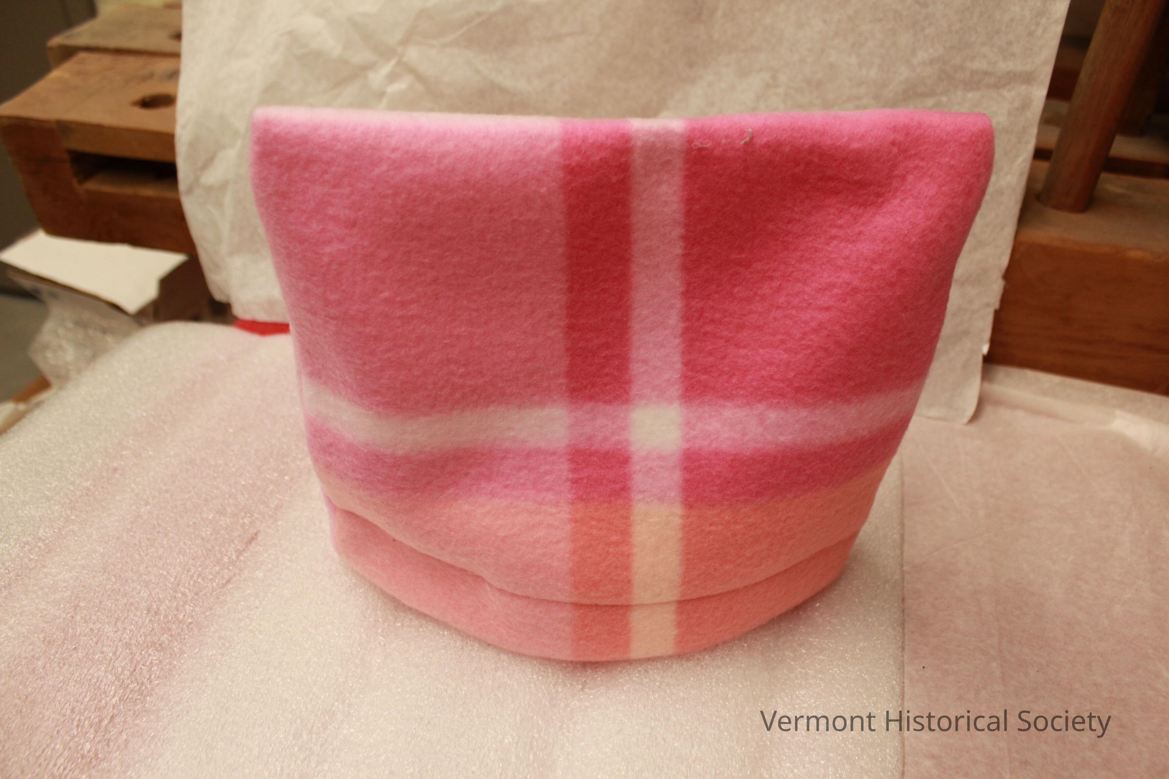 Rectangular pink-and-white plaid fleece hat. There is a narrow band around the opening.Context