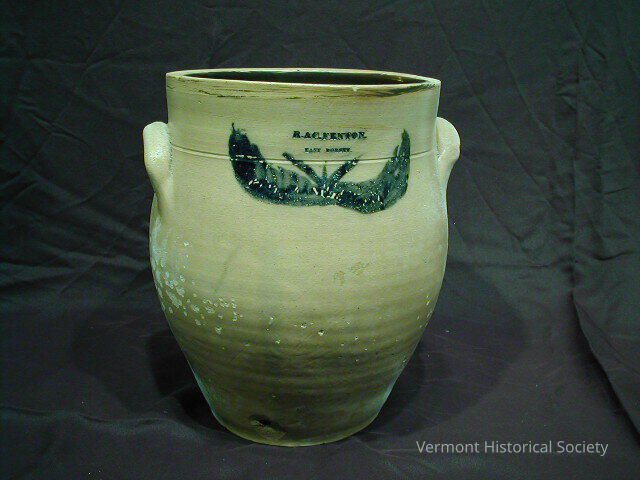 Hand thrown stoneware crock with blue decoration of bird wings and the stamped mark, "R. & R. FENTON./EAST DORSET." The body of the crock flares outward at the center, then slightly back inward toward the top. There is a U-shaped handle on either side, and an incised line that goes around the top about three inches below the lip.Context