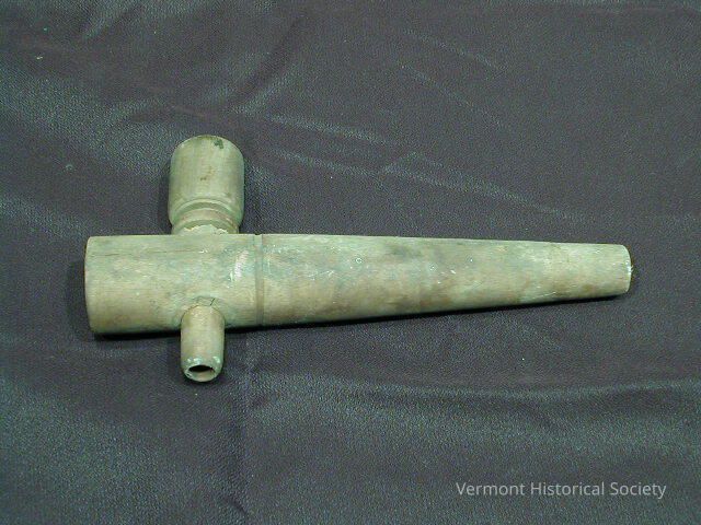 Wooden spigot. The spout narrows on one end. There is a peg inserted perpendicularly into the spout near the wide end.